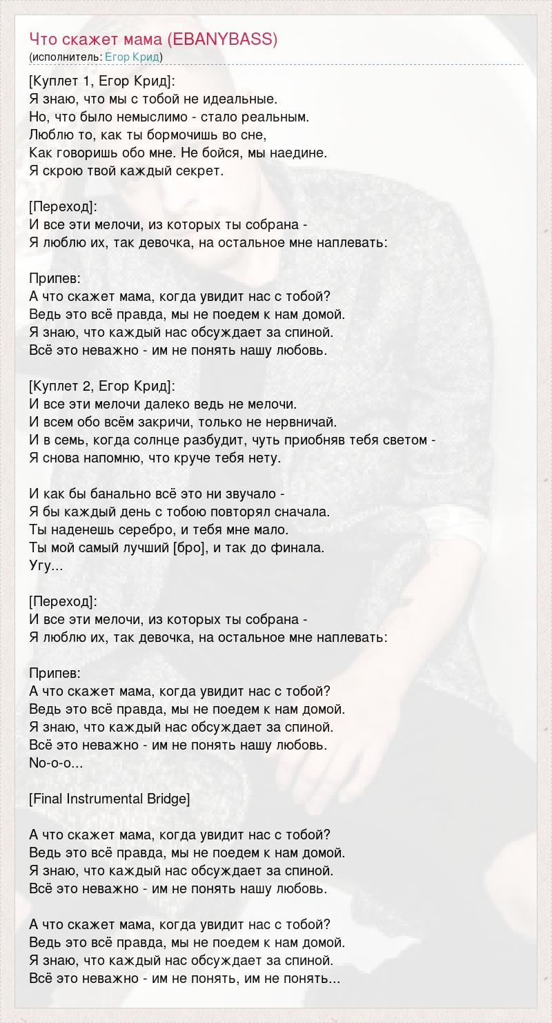 [Куплет 1, Егор Крид]: Я знаю, что мы с тобой не идеальные. Но, что было немыслимо - стало реальным. Люблю то, как ты бормочишь во сне, Как говоришь обо мне. Не бойся, мы наедине. Я скрою твой каждый секрет. [Переход]: И все эти мелочи, из которых ты собрана - Я люблю их, так девочка, на остальное мне наплевать: Припев: А что скажет мама, когда увидит нас с тобой? Ведь это всё правда, мы не поедем к нам домой. Я знаю, что каждый нас обсуждает за спиной. Всё это неважно - им не понять нашу любовь. [Куплет 2, Егор Крид]: И все эти мелочи далеко ведь не мелочи. И всем обо всём закричи, только не нервничай. И в семь, когда солнце разбудит, чуть приобняв тебя светом - Я снова напомню, что круче тебя нету. И как бы банально всё это ни звучало - Я бы каждый день с тобою повторял сначала. Ты наденешь серебро, и тебя мне мало. Ты мой самый лучший [бро], и так до финала. Угу... [Переход]: И все эти мелочи, из которых ты собрана - Я люблю их, так девочка, на остальное мне наплевать: Припев: А что скажет мама, когда увидит нас с тобой? Ведь это всё правда, мы не поедем к нам домой. Я знаю, что каждый нас обсуждает за спиной. Всё это неважно - им не понять нашу любовь. No-o-o... [Final Instrumental Bridge] А что скажет мама, когда увидит нас с тобой? Ведь это всё правда, мы не поедем к нам домой. Я знаю, что каждый нас обсуждает за спиной. Всё это неважно - им не понять нашу любовь. А что скажет мама, когда увидит нас с тобой? Ведь это всё правда, мы не поедем к нам домой. Я знаю, что каждый нас обсуждает за спиной. Всё это неважно - им не понять, им не понять...