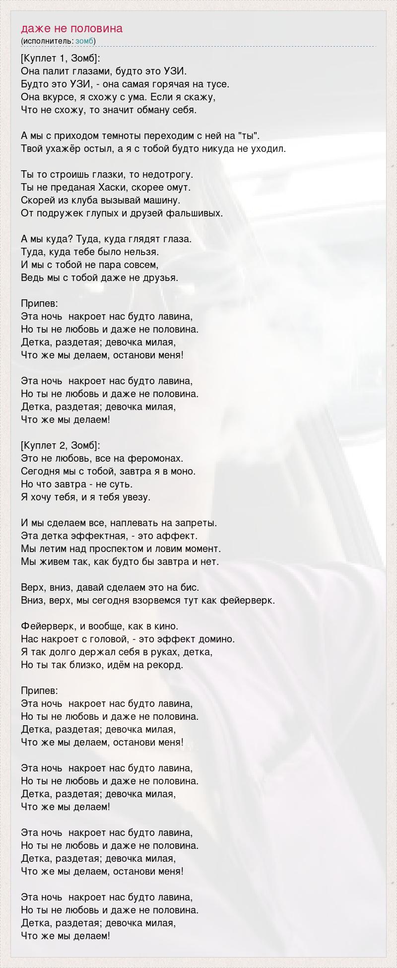 [Куплет 1, Зомб]: Она палит глазами, будто это УЗИ. Будто это УЗИ, - она самая горячая на тусе. Она вкурсе, я схожу с ума. Если я скажу, Что не схожу, то значит обману себя. А мы с приходом темноты переходим с ней на "ты". Твой ухажёр остыл, а я с тобой будто никуда не уходил. Ты то строишь глазки, то недотрогу. Ты не преданая Хаски, скорее омут. Скорей из клуба вызывай машину. От подружек глупых и друзей фальшивых. А мы куда? Туда, куда глядят глаза. Туда, куда тебе было нельзя. И мы с тобой не пара совсем, Ведь мы с тобой даже не друзья. Припев: Эта ночь накроет нас будто лавина, Но ты не любовь и даже не половина. Детка, раздетая; девочка милая, Что же мы делаем, останови меня! Эта ночь накроет нас будто лавина, Но ты не любовь и даже не половина. Детка, раздетая; девочка милая, Что же мы делаем! [Куплет 2, Зомб]: Это не любовь, все на феромонах. Сегодня мы с тобой, завтра я в моно. Но что завтра - не суть. Я хочу тебя, и я тебя увезу. И мы сделаем все, наплевать на запреты. Эта детка эффектная, - это аффект. Мы летим над проспектом и ловим момент. Мы живем так, как будто бы завтра и нет. Верх, вниз, давай сделаем это на бис. Вниз, верх, мы сегодня взорвемся тут как фейерверк. Фейерверк, и вообще, как в кино. Нас накроет с головой, - это эффект домино. Я так долго держал себя в руках, детка, Но ты так близко, идём на рекорд. Припев: Эта ночь накроет нас будто лавина, Но ты не любовь и даже не половина. Детка, раздетая; девочка милая, Что же мы делаем, останови меня! Эта ночь накроет нас будто лавина, Но ты не любовь и даже не половина. Детка, раздетая; девочка милая, Что же мы делаем! Эта ночь накроет нас будто лавина, Но ты не любовь и даже не половина. Детка, раздетая; девочка милая, Что же мы делаем, останови меня! Эта ночь накроет нас будто лавина, Но ты не любовь и даже не половина. Детка, раздетая; девочка милая, Что же мы делаем!