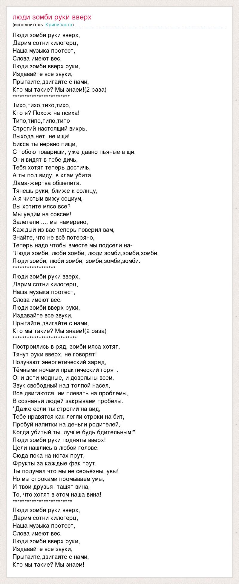 Люди зомби руки вверх, Дарим сотни килогерц, Наша музыка протест, Слова имеют вес. Люди зомби вверх руки, Издавайте все звуки, Прыгайте,двигайте с нами, Кто мы такие? Мы знаем!(2 раза) ************************ Тихо,тихо,тихо,тихо, Кто я? Похож на психа! Типо,типо,типо,типо Строгий настоящий вихрь. Выхода нет, не ищи! Бикса ты нервно пищи, С тобою товарищи, уже давно пьяные в щи. Они видят в тебе дичь, Тебя хотят теперь достичь, А ты под виду, в хлам убита, Дама-жертва общепита. Тянешь руки, ближе к солнцу, А я чистым вижу социум, Вы хотите мясо все? Мы уедим на совсем! Залетели .... мы намерено, Каждый из вас теперь поверил вам, Знайте, что не всё потеряно, Теперь надо чтобы вместе мы подсели на- "Люди зомби, люби зомби, люди зомби,зомби,зомби. Люди зомби, люби зомби, зомби,зомби,зомби. ****************** Люди зомби руки вверх, Дарим сотни килогерц, Наша музыка протест, Слова имеют вес. Люди зомби вверх руки, Издавайте все звуки, Прыгайте,двигайте с нами, Кто мы такие? Мы знаем!(2 раза) *************************** Построились в ряд, зомби мяса хотят, Тянут руки вверх, не говорят! Получают энергетический заряд, Тёмными ночами практический горят. Они дети модные, и довольны всем, Звук свободный над толпой насел, Все двигаются, им плевать на проблемы, В сознаньи людей закрываем пробелы. *Даже если ты строгий на вид, Тебе нравятся как легли строки на бит, Пробуй напитки на деньги родителей, Когда убитый ты, лучше будь бдительным!* Люди зомби руки подняты вверх! Цели нашлись в любой голове. Сюда пока на ногах прут, Фрукты за каждые фак трут. Ты подумал что мы не серьёзны, увы! Но мы строками промываем умы, И твои друзья- тащят вина, То, что хотят в этом наша вина! ************************* Люди зомби руки вверх, Дарим сотни килогерц, Наша музыка протест, Слова имеют вес. Люди зомби вверх руки, Издавайте все звуки, Прыгайте,двигайте с нами, Кто мы такие? Мы знаем!