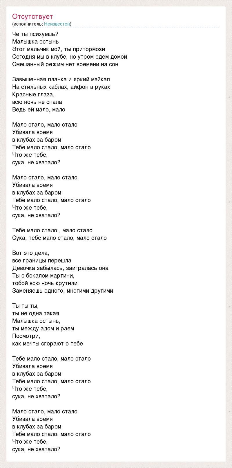 Че ты психуешь? Малышка остынь Этот мальчик мой, ты притормози Сегодня мы в клубе, но утром едем домой Смешанный режим нет времени на сон Завышенная планка и яркий мэйкап На стильных каблах, айфон в руках Красные глаза, всю ночь не спала Ведь ей мало, мало Мало стало, мало стало Убивала время в клубах за баром Тебе мало стало, мало стало Что же тебе, сука, не хватало? Мало стало, мало стало Убивала время в клубах за баром Тебе мало стало, мало стало Что же тебе, сука, не хватало? Тебе мало стало , мало стало Сука, тебе мало стало, мало стало Вот это дела, все границы перешла Девочка забылась, заигралась она Ты с бокалом мартини, тобой всю ночь крутили Заменяешь одного, многими другими Ты ты ты, ты не одна такая Малышка остынь, ты между адом и раем Посмотри, как мечты сгорают о тебе Тебе мало стало, мало стало Убивала время в клубах за баром Тебе мало стало, мало стало Что же тебе, сука, не хватало? Мало стало, мало стало Убивала время в клубах за баром Тебе мало стало, мало стало Что же тебе, сука, не хватало?