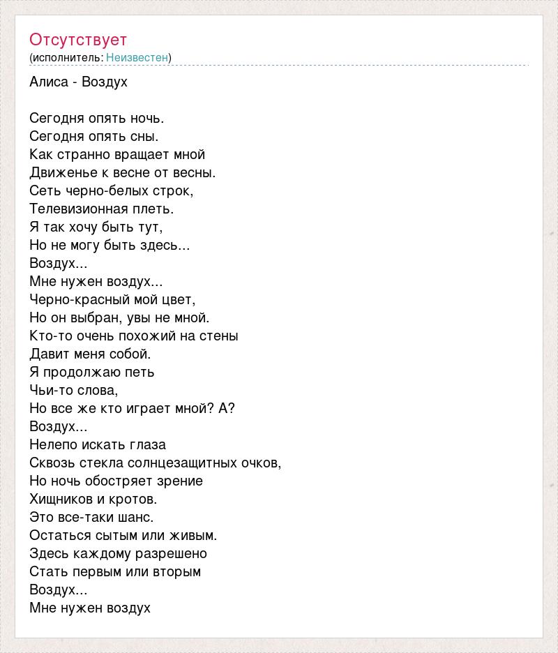 Алиса - Воздух Сегодня опять ночь. Сегодня опять сны. Как странно вращает мной Движенье к весне от весны. Сеть черно-белых строк, Телевизионная плеть. Я так хочу быть тут, Но не могу быть здесь... Воздух... Мне нужен воздух... Черно-красный мой цвет, Но он выбран, увы не мной. Кто-то очень похожий на стены Давит меня собой. Я продолжаю петь Чьи-то слова, Но все же кто играет мной? А? Воздух... Нелепо искать глаза Сквозь стекла солнцезащитных очков, Но ночь обостряет зрение Хищников и кротов. Это все-таки шанс. Остаться сытым или живым. Здесь каждому разрешено Стать первым или вторым Воздух... Мне нужен воздух