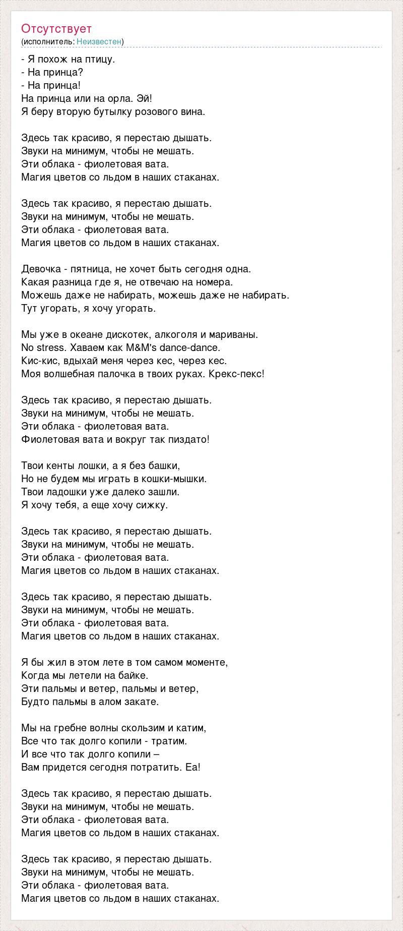 - Я похож на птицу. - На принца? - На принца! На принца или на орла. Эй! Я беру вторую бутылку розового вина. Здесь так красиво, я перестаю дышать. Звуки на минимум, чтобы не мешать. Эти облака - фиолетовая вата. Магия цветов со льдом в наших стаканах. Здесь так красиво, я перестаю дышать. Звуки на минимум, чтобы не мешать. Эти облака - фиолетовая вата. Магия цветов со льдом в наших стаканах. Девочка - пятница, не хочет быть сегодня одна. Какая разница где я, не отвечаю на номера. Можешь даже не набирать, можешь даже не набирать. Тут угорать, я хочу угорать. Мы уже в океане дискотек, алкоголя и мариваны. No stress. Хаваем как M&M's dance-dance. Кис-кис, вдыхай меня через кес, через кес. Моя волшебная палочка в твоих руках. Крекс-пекс! Здесь так красиво, я перестаю дышать. Звуки на минимум, чтобы не мешать. Эти облака - фиолетовая вата. Фиолетовая вата и вокруг так пиздато! Твои кенты лошки, а я без башки, Но не будем мы играть в кошки-мышки. Твои ладошки уже далеко зашли. Я хочу тебя, а еще хочу сижку. Здесь так красиво, я перестаю дышать. Звуки на минимум, чтобы не мешать. Эти облака - фиолетовая вата. Магия цветов со льдом в наших стаканах. Здесь так красиво, я перестаю дышать. Звуки на минимум, чтобы не мешать. Эти облака - фиолетовая вата. Магия цветов со льдом в наших стаканах. Я бы жил в этом лете в том самом моменте, Когда мы летели на байке. Эти пальмы и ветер, пальмы и ветер, Будто пальмы в алом закате. Мы на гребне волны скользим и катим, Все что так долго копили - тратим. И все что так долго копили – Вам придется сегодня потратить. Еа! Здесь так красиво, я перестаю дышать. Звуки на минимум, чтобы не мешать. Эти облака - фиолетовая вата. Магия цветов со льдом в наших стаканах. Здесь так красиво, я перестаю дышать. Звуки на минимум, чтобы не мешать. Эти облака - фиолетовая вата. Магия цветов со льдом в наших стаканах.