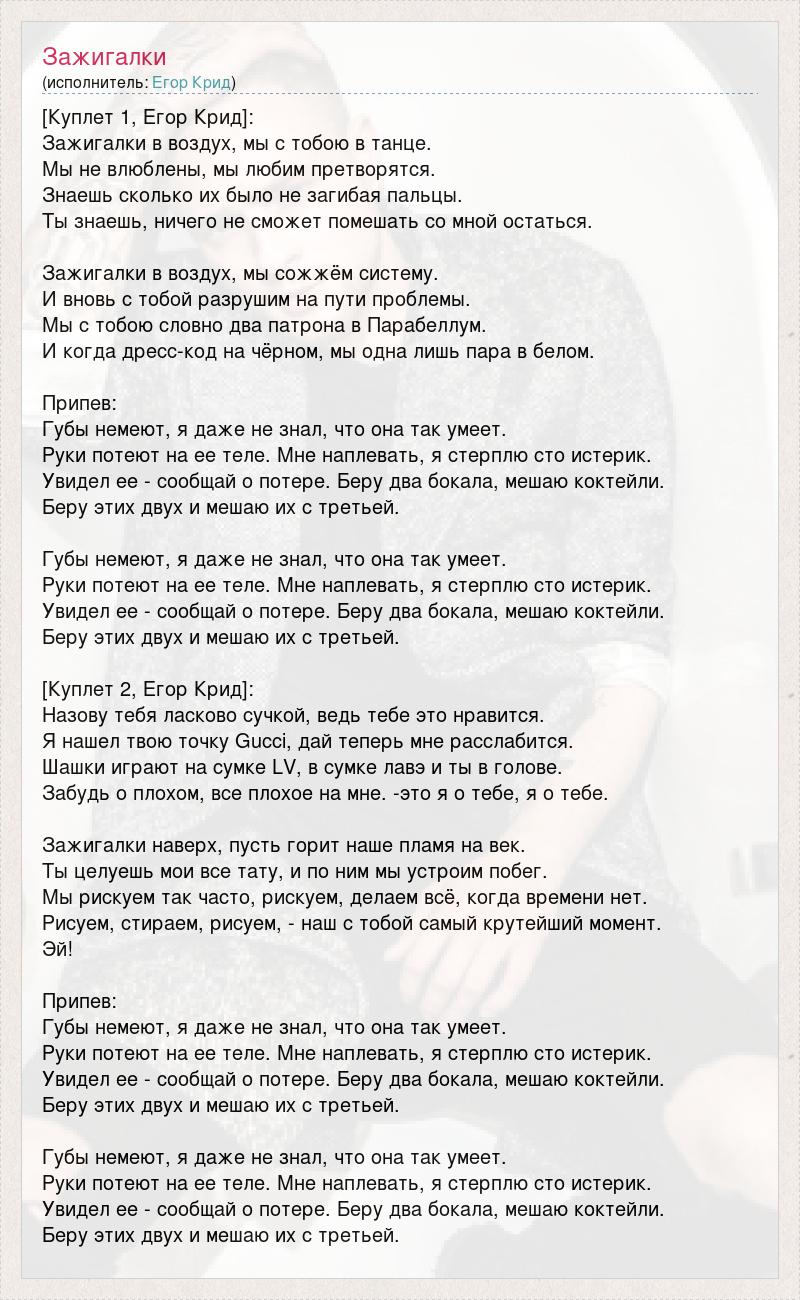 [Куплет 1, Егор Крид]: Зажигалки в воздух, мы с тобою в танце. Мы не влюблены, мы любим претворятся. Знаешь сколько их было не загибая пальцы. Ты знаешь, ничего не сможет помешать со мной остаться. Зажигалки в воздух, мы сожжём систему. И вновь с тобой разрушим на пути проблемы. Мы с тобою словно два патрона в Парабеллум. И когда дресс-код на чёрном, мы одна лишь пара в белом. Припев: Губы немеют, я даже не знал, что она так умеет. Руки потеют на ее теле. Мне наплевать, я стерплю сто истерик. Увидел ее - сообщай о потере. Беру два бокала, мешаю коктейли. Беру этих двух и мешаю их с третьей. Губы немеют, я даже не знал, что она так умеет. Руки потеют на ее теле. Мне наплевать, я стерплю сто истерик. Увидел ее - сообщай о потере. Беру два бокала, мешаю коктейли. Беру этих двух и мешаю их с третьей. [Куплет 2, Егор Крид]: Назову тебя ласково сучкой, ведь тебе это нравится. Я нашел твою точку Gucci, дай теперь мне расслабится. Шашки играют на сумке LV, в сумке лавэ и ты в голове. Забудь о плохом, все плохое на мне. -это я о тебе, я о тебе. Зажигалки наверх, пусть горит наше пламя на век. Ты целуешь мои все тату, и по ним мы устроим побег. Мы рискуем так часто, рискуем, делаем всё, когда времени нет. Рисуем, стираем, рисуем, - наш с тобой самый крутейший момент. Эй! Припев: Губы немеют, я даже не знал, что она так умеет. Руки потеют на ее теле. Мне наплевать, я стерплю сто истерик. Увидел ее - сообщай о потере. Беру два бокала, мешаю коктейли. Беру этих двух и мешаю их с третьей. Губы немеют, я даже не знал, что она так умеет. Руки потеют на ее теле. Мне наплевать, я стерплю сто истерик. Увидел ее - сообщай о потере. Беру два бокала, мешаю коктейли. Беру этих двух и мешаю их с третьей.