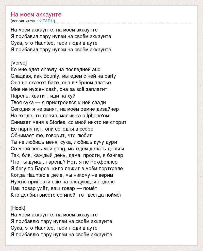 На моём аккаунте, на моём аккаунте Я прибавил пару нулей на своём аккаунте Сука, это Haunted, твои люди в ауте Я прибавил пару нулей на своём аккаунте [Verse] Ко мне едет shawty на последней audi Сладкая, как Bounty, мы едем с ней на party Она не скажет бате, она в чёрном платье Мне не нужен cash, она за всё заплатит Парень, хватит, иди на хуй Твоя сука — я пристроился к ней сзади Сегодня я не занят, на моём ремне дизайнер На входе, ты понял, малышка с Iphone'ом Снимает меня в Stories, со мной никто не спорит Её парня нет, они сегодня в ссоре Обнимает me, говорит, что любит Ты не любишь меня, сука, любишь кучу дури Со мной весь мой gang, мы едем делать деньги Так, бля, каждый день, дама, прости, я бэнгер Что ты думал, парень? Нет, я не Рокфеллер Я бегу по Барсе, кило лежит в моём портфеле Когда Haunted в деле, мы никому не верим Нужно принести ещё на следующей неделе Наш товар улёт, ваш товар — помёт Кто долбил вместе со мной, тот всегда поймёт [Hook] На моём аккаунте, на моём аккаунте Я прибавлю пару нулей на своём аккаунте Сука, это Haunted, твои люди в ауте Я прибавлю пару нулей на своём аккаунте