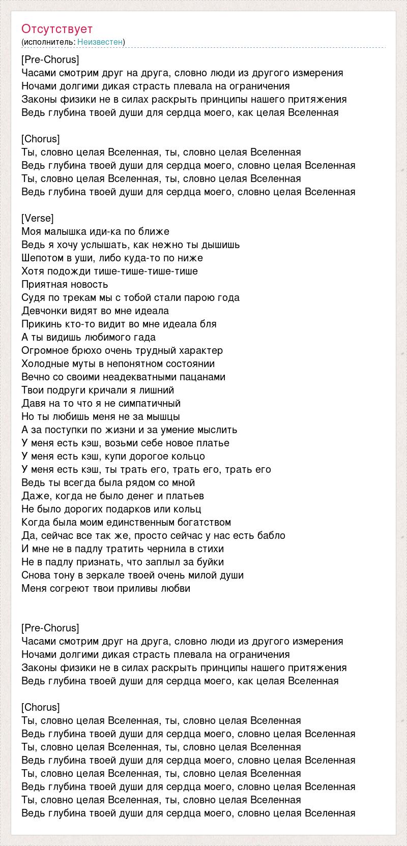 [Pre-Chorus] Часами смотрим друг на друга, словно люди из другого измерения Ночами долгими дикая страсть плевала на ограничения Законы физики не в силах раскрыть принципы нашего притяжения Ведь глубина твоей души для сердца моего, как целая Вселенная [Chorus] Ты, словно целая Вселенная, ты, словно целая Вселенная Ведь глубина твоей души для сердца моего, словно целая Вселенная Ты, словно целая Вселенная, ты, словно целая Вселенная Ведь глубина твоей души для сердца моего, словно целая Вселенная [Verse] Моя малышка иди-ка по ближе Ведь я хочу услышать, как нежно ты дышишь Шепотом в уши, либо куда-то по ниже Хотя подожди тише-тише-тише-тише Приятная новость Судя по трекам мы с тобой стали парою года Девчонки видят во мне идеала Прикинь кто-то видит во мне идеала бля А ты видишь любимого гада Огромное брюхо очень трудный характер Холодные муты в непонятном состоянии Вечно со своими неадекватными пацанами Твои подруги кричали я лишний Давя на то что я не симпатичный Но ты любишь меня не за мышцы А за поступки по жизни и за умение мыслить У меня есть кэш, возьми себе новое платье У меня есть кэш, купи дорогое кольцо У меня есть кэш, ты трать его, трать его, трать его Ведь ты всегда была рядом со мной Даже, когда не было денег и платьев Не было дорогих подарков или кольц Когда была моим единственным богатством Да, сейчас все так же, просто сейчас у нас есть бабло И мне не в падлу тратить чернила в стихи Не в падлу признать, что заплыл за буйки Снова тону в зеркале твоей очень милой души Меня согреют твои приливы любви [Pre-Chorus] Часами смотрим друг на друга, словно люди из другого измерения Ночами долгими дикая страсть плевала на ограничения Законы физики не в силах раскрыть принципы нашего притяжения Ведь глубина твоей души для сердца моего, как целая Вселенная [Chorus] Ты, словно целая Вселенная, ты, словно целая Вселенная Ведь глубина твоей души для сердца моего, словно целая Вселенная Ты, словно целая Вселенная, ты, словно целая Вселенная Ведь глубина твоей души для сердца моего, словно целая Вселенная Ты, словно целая Вселенная, ты, словно целая Вселенная Ведь глубина твоей души для сердца моего, словно целая Вселенная Ты, словно целая Вселенная, ты, словно целая Вселенная Ведь глубина твоей души для сердца моего, словно целая Вселенная