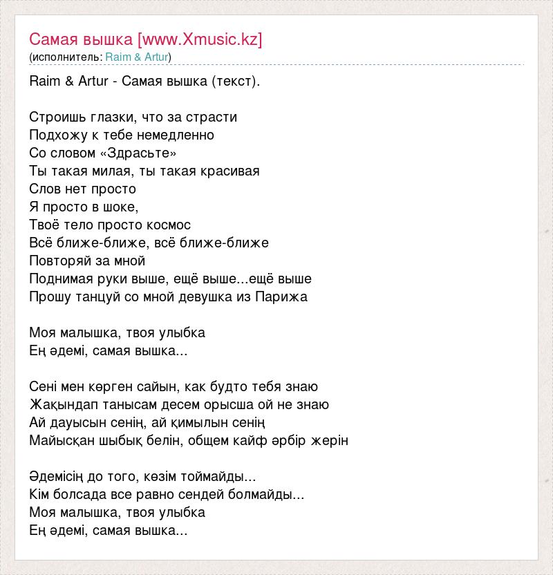 Raim & Artur - Самая вышка (текст). Строишь глазки, что за страсти Подхожу к тебе немедленно Со словом «Здрасьте» Ты такая милая, ты такая красивая Слов нет просто Я просто в шоке, Твоё тело просто космос Всё ближе-ближе, всё ближе-ближе Повторяй за мной Поднимая руки выше, ещё выше...ещё выше Прошу танцуй со мной девушка из Парижа Моя малышка, твоя улыбка Ең әдемі, самая вышка... Сені мен көрген сайын, как будто тебя знаю Жақындап танысам десем орысша ой не знаю Ай дауысын сенің, ай қимылын сенің Майысқан шыбық белін, общем кайф әрбір жерін Әдемісің до того, көзім тоймайды... Кім болсада все равно сендей болмайды... Моя малышка, твоя улыбка Ең әдемі, самая вышка...