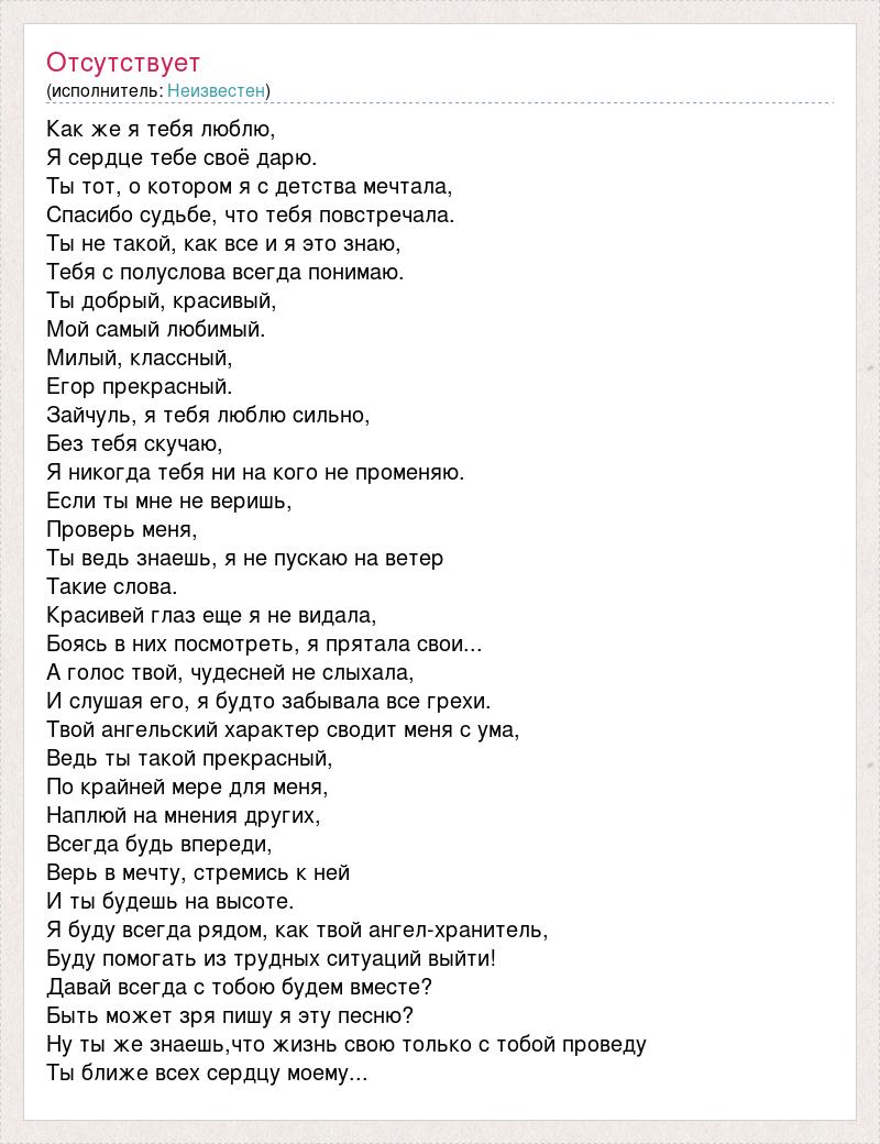 Как же я тебя люблю, Я сердце тебе своё дарю. Ты тот, о котором я с детства мечтала, Спасибо судьбе, что тебя повстречала. Ты не такой, как все и я это знаю, Тебя с полуслова всегда понимаю. Ты добрый, красивый, Мой самый любимый. Милый, классный, Егор прекрасный. Зайчуль, я тебя люблю сильно, Без тебя скучаю, Я никогда тебя ни на кого не променяю. Если ты мне не веришь, Проверь меня, Ты ведь знаешь, я не пускаю на ветер Такие слова. Красивей глаз еще я не видала, Боясь в них посмотреть, я прятала свои... А голос твой, чудесней не слыхала, И слушая его, я будто забывала все грехи. Твой ангельский характер сводит меня с ума, Ведь ты такой прекрасный, По крайней мере для меня, Наплюй на мнения других, Всегда будь впереди, Верь в мечту, стремись к ней И ты будешь на высоте. Я буду всегда рядом, как твой ангел-хранитель, Буду помогать из трудных ситуаций выйти! Давай всегда с тобою будем вместе? Быть может зря пишу я эту песню? Ну ты же знаешь,что жизнь свою только с тобой проведу Ты ближе всех сердцу моему...