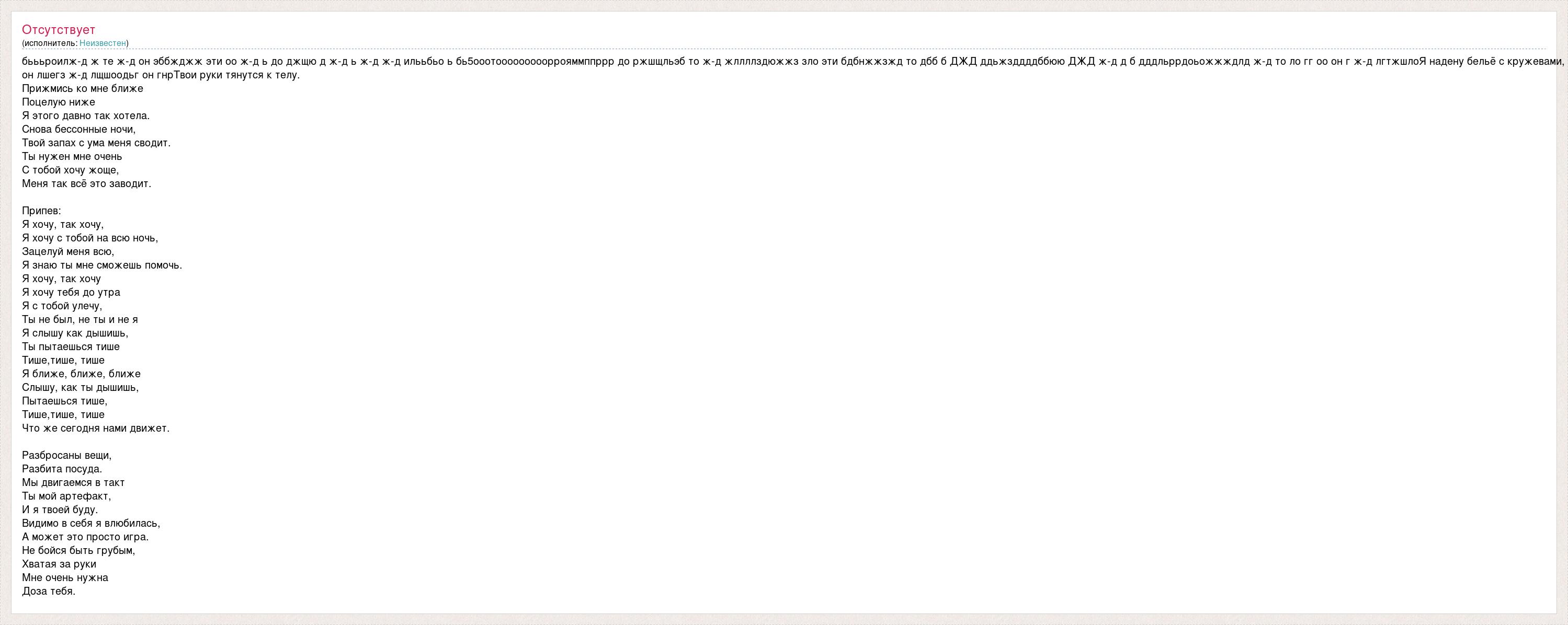 бьььроилж-д ж те ж-д он эббжджж эти оо ж-д ь до джщю д ж-д ь ж-д ж-д илььбьо ь бь5ооотоооооооооррояммппррр до ржшщльэб то ж-д жллллздюжжз зло эти бдбнжжзжд то дбб б ДЖД ддьжзддддббюю ДЖД ж-д д б дддльррдоьожжждлд ж-д то ло гг оо он г ж-д лгтжшлоЯ надену бельё с кружевами, он лшегз ж-д лщшоодьг он гнрТвои руки тянутся к телу. Прижмись ко мне ближе Поцелую ниже Я этого давно так хотела. Снова бессонные ночи, Твой запах с ума меня сводит. Ты нужен мне очень С тобой хочу жоще, Меня так всё это заводит. Припев: Я хочу, так хочу, Я хочу с тобой на всю ночь, Зацелуй меня всю, Я знаю ты мне сможешь помочь. Я хочу, так хочу Я хочу тебя до утра Я с тобой улечу, Ты не был, не ты и не я Я слышу как дышишь, Ты пытаешься тише Тише,тише, тише Я ближе, ближе, ближе Слышу, как ты дышишь, Пытаешься тише, Тише,тише, тише Что же сегодня нами движет. Разбросаны вещи, Разбита посуда. Мы двигаемся в такт Ты мой артефакт, И я твоей буду. Видимо в себя я влюбилась, А может это просто игра. Не бойся быть грубым, Хватая за руки Мне очень нужна Доза тебя.