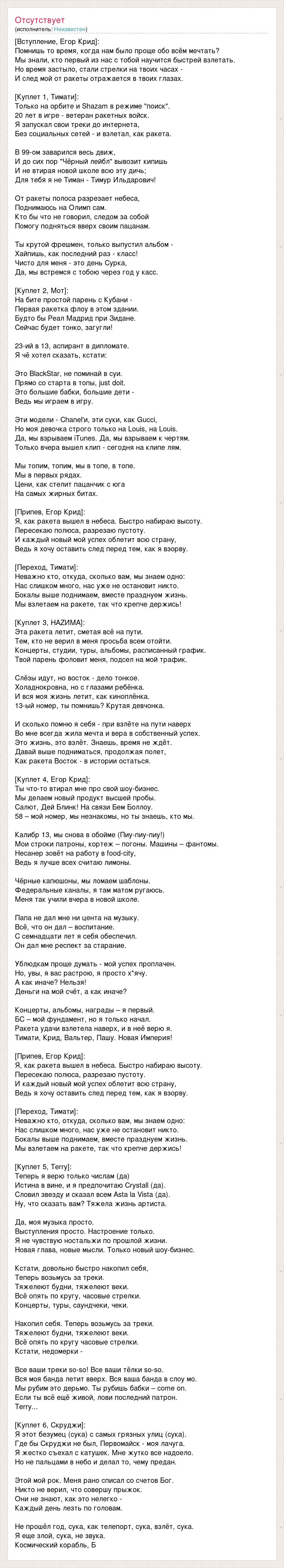 [Вступление, Егор Крид]: Помнишь то время, когда нам было проще обо всём мечтать? Мы знали, кто первый из нас с тобой научится быстрей взлетать. Но время застыло, стали стрелки на твоих часах - И след мой от ракеты отражается в твоих глазах. [Куплет 1, Тимати]: Только на орбите и Shazam в режиме "поиск". 20 лет в игре - ветеран ракетных войск. Я запускал свои треки до интернета, Без социальных сетей - и взлетал, как ракета. В 99-ом заварился весь движ, И до сих пор "Чёрный лейбл" вывозит кипишь И не втирая новой школе всю эту дичь; Для тебя я не Тиман - Тимур Ильдарович! От ракеты полоса разрезает небеса, Поднимаюсь на Олимп сам. Кто бы что не говорил, следом за собой Помогу подняться вверх своим пацанам. Ты крутой фрешмен, только выпустил альбом - Хайпишь, как последний раз - класс! Чисто для меня - это день Сурка, Да, мы встремся с тобою через год у касс. [Куплет 2, Мот]: На бите простой парень с Кубани - Первая ракетка флоу в этом здании. Будто бы Реал Мадрид при Зидане. Сейчас будет тонко, загугли! 23-ий в 13, аспирант в дипломате. Я чё хотел сказать, кстати: Это BlackStar, не поминай в суи. Прямо со старта в топы, just doit. Это большие бабки, большие дети - Ведь мы играем в игру. Эти модели - Chanel'и, эти суки, как Gucci, Но моя девочка строго только на Louis, на Louis. Да, мы взрываем iTunes. Да, мы взрываем к чертям. Только вчера вышел клип - сегодня на клипе лям. Мы топим, топим, мы в топе, в топе. Мы в первых рядах. Цени, как стелит пацанчик с юга На самых жирных битах. [Припев, Егор Крид]: Я, как ракета вышел в небеса. Быстро набираю высоту. Пересекаю полюса, разрезаю пустоту. И каждый новый мой успех облетит всю страну, Ведь я хочу оставить след перед тем, как я взорву. [Переход, Тимати]: Неважно кто, откуда, сколько вам, мы знаем одно: Нас слишком много, нас уже не остановит никто. Бокалы выше поднимаем, вместе празднуем жизнь. Мы взлетаем на ракете, так что крепче держись! [Куплет 3, НАZИМА]: Эта ракета летит, сметая всё на пути. Тем, кто не верил в меня просьба всем отойти. Концерты, студии, туры, альбомы, расписанный график. Твой парень фоловит меня, подсел на мой трафик. Слёзы идут, но восток - дело тонкое. Холаднокровна, но с глазами ребёнка. И вся моя жизнь летит, как киноплёнка. 13-ый номер, ты помнишь? Крутая девчонка. И сколько помню я себя - при взлёте на пути наверх Во мне всегда жила мечта и вера в собственный успех. Это жизнь, это взлёт. Знаешь, время не ждёт. Давай выше подниматься, продолжая полет, Как ракета Восток - в истории остаться. [Куплет 4, Егор Крид]: Ты что-то втирал мне про свой шоу-бизнес. Мы делаем новый продукт высшей пробы. Салют, Дей Блинк! На связи Бем Боллоу. 58 – мой номер, мы незнакомы, но ты знаешь, кто мы. Калибр 13, мы снова в обойме (Пиу-пиу-пиу!) Мои строки патроны, кортеж – погоны. Машины – фантомы. Несанер зовёт на работу в food-city, Ведь я лучше всех считаю лимоны. Чёрные капюшоны, мы ломаем шаблоны. Федеральные каналы, я там матом ругаюсь. Меня так учили вчера в новой школе. Папа не дал мне ни цента на музыку. Всё, что он дал – воспитание. С семнадцати лет я себя обеспечил. Он дал мне респект за старание. Ублюдкам проще думать - мой успех проплачен. Но, увы, я вас растрою, я просто х*ячу. А как иначе? Нельзя! Деньги на мой счёт, а как иначе? Концерты, альбомы, награды – я первый. БС – мой фундамент, но я только начал. Ракета удачи взлетела наверх, и в неё верю я. Тимати, Крид, Вальтер, Пашу. Новая Империя! [Припев, Егор 