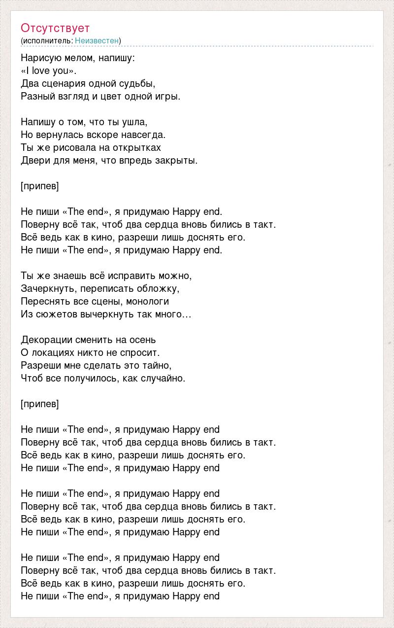 Нарисую мелом, напишу: «I love you». Два сценария одной судьбы, Разный взгляд и цвет одной игры. Напишу о том, что ты ушла, Но вернулась вскоре навсегда. Ты же рисовала на открытках Двери для меня, что впредь закрыты. [припев] Не пиши «The end», я придумаю Happy end. Поверну всё так, чтоб два сердца вновь бились в такт. Всё ведь как в кино, разреши лишь доснять его. Не пиши «The end», я придумаю Happy end. Ты же знаешь всё исправить можно, Зачеркнуть, переписать обложку, Переснять все сцены, монологи Из сюжетов вычеркнуть так много… Декорации сменить на осень О локациях никто не спросит. Разреши мне сделать это тайно, Чтоб все получилось, как случайно. [припев] Не пиши «The end», я придумаю Happy end Поверну всё так, чтоб два сердца вновь бились в такт. Всё ведь как в кино, разреши лишь доснять его. Не пиши «The end», я придумаю Happy end Не пиши «The end», я придумаю Happy end Поверну всё так, чтоб два сердца вновь бились в такт. Всё ведь как в кино, разреши лишь доснять его. Не пиши «The end», я придумаю Happy end Не пиши «The end», я придумаю Happy end Поверну всё так, чтоб два сердца вновь бились в такт. Всё ведь как в кино, разреши лишь доснять его. Не пиши «The end», я придумаю Happy end
