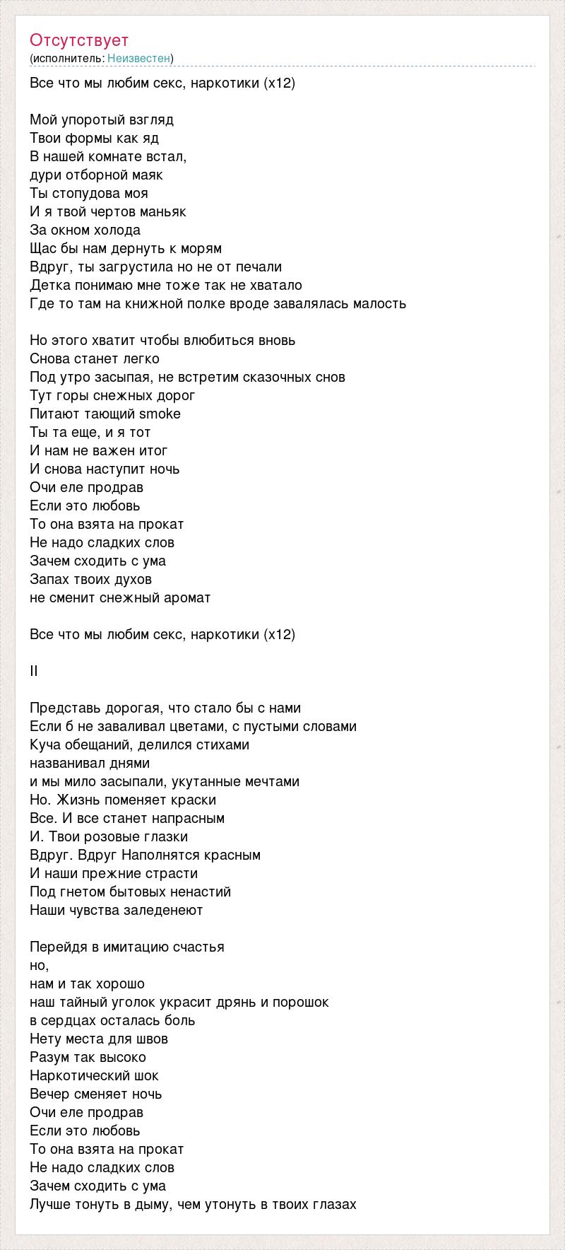 Все что мы любим секс, наркотики (х12) Мой упоротый взгляд Твои формы как яд В нашей комнате встал, дури отборной маяк Ты стопудова моя И я твой чертов маньяк За окном холода Щас бы нам дернуть к морям Вдруг, ты загрустила но не от печали Детка понимаю мне тоже так не хватало Где то там на книжной полке вроде завалялась малость Но этого хватит чтобы влюбиться вновь Снова станет легко Под утро засыпая, не встретим сказочных снов Тут горы снежных дорог Питают тающий smoke Ты та еще, и я тот И нам не важен итог И снова наступит ночь Очи еле продрав Если это любовь То она взята на прокат Не надо сладких слов Зачем сходить с ума Запах твоих духов не сменит снежный аромат Все что мы любим секс, наркотики (х12) II Представь дорогая, что стало бы с нами Если б не заваливал цветами, с пустыми словами Куча обещаний, делился стихами названивал днями и мы мило засыпали, укутанные мечтами Но. Жизнь поменяет краски Все. И все станет напрасным И. Твои розовые глазки Вдруг. Вдруг Наполнятся красным И наши прежние страсти Под гнетом бытовых ненастий Наши чувства заледенеют Перейдя в имитацию счастья но, нам и так хорошо наш тайный уголок украсит дрянь и порошок в сердцах осталась боль Нету места для швов Разум так высоко Наркотический шок Вечер сменяет ночь Очи еле продрав Если это любовь То она взята на прокат Не надо сладких слов Зачем сходить с ума Лучше тонуть в дыму, чем утонуть в твоих глазах
