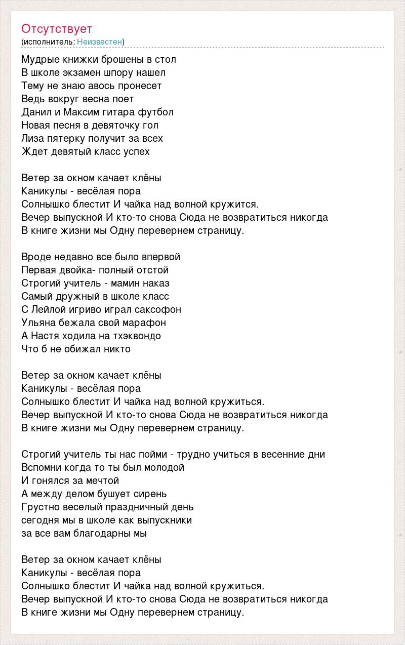 Мудрые книжки брошены в стол В школе экзамен шпору нашел Тему не знаю авось пронесет Ведь вокруг весна поет Данил и Максим гитара футбол Новая песня в девяточку гол Лиза пятерку получит за всех Ждет девятый класс успех Ветер за окном качает клёны Каникулы - весёлая пора Солнышко блестит И чайка над волной кружится. Вечер выпускной И кто-то снова Сюда не возвратиться никогда В книге жизни мы Одну перевернем страницу. Вроде недавно все было впервой Первая двойка- полный отстой Строгий учитель - мамин наказ Самый дружный в школе класс С Лейлой игриво играл саксофон Ульяна бежала свой марафон А Настя ходила на тхэквондо Что б не обижал никто Ветер за окном качает клёны Каникулы - весёлая пора Солнышко блестит И чайка над волной кружиться. Вечер выпускной И кто-то снова Сюда не возвратиться никогда В книге жизни мы Одну перевернем страницу. Строгий учитель ты нас пойми - трудно учиться в весенние дни Вспомни когда то ты был молодой И гонялся за мечтой А между делом бушует сирень Грустно веселый праздничный день сегодня мы в школе как выпускники за все вам благодарны мы Ветер за окном качает клёны Каникулы - весёлая пора Солнышко блестит И чайка над волной кружиться. Вечер выпускной И кто-то снова Сюда не возвратиться никогда В книге жизни мы Одну перевернем страницу.