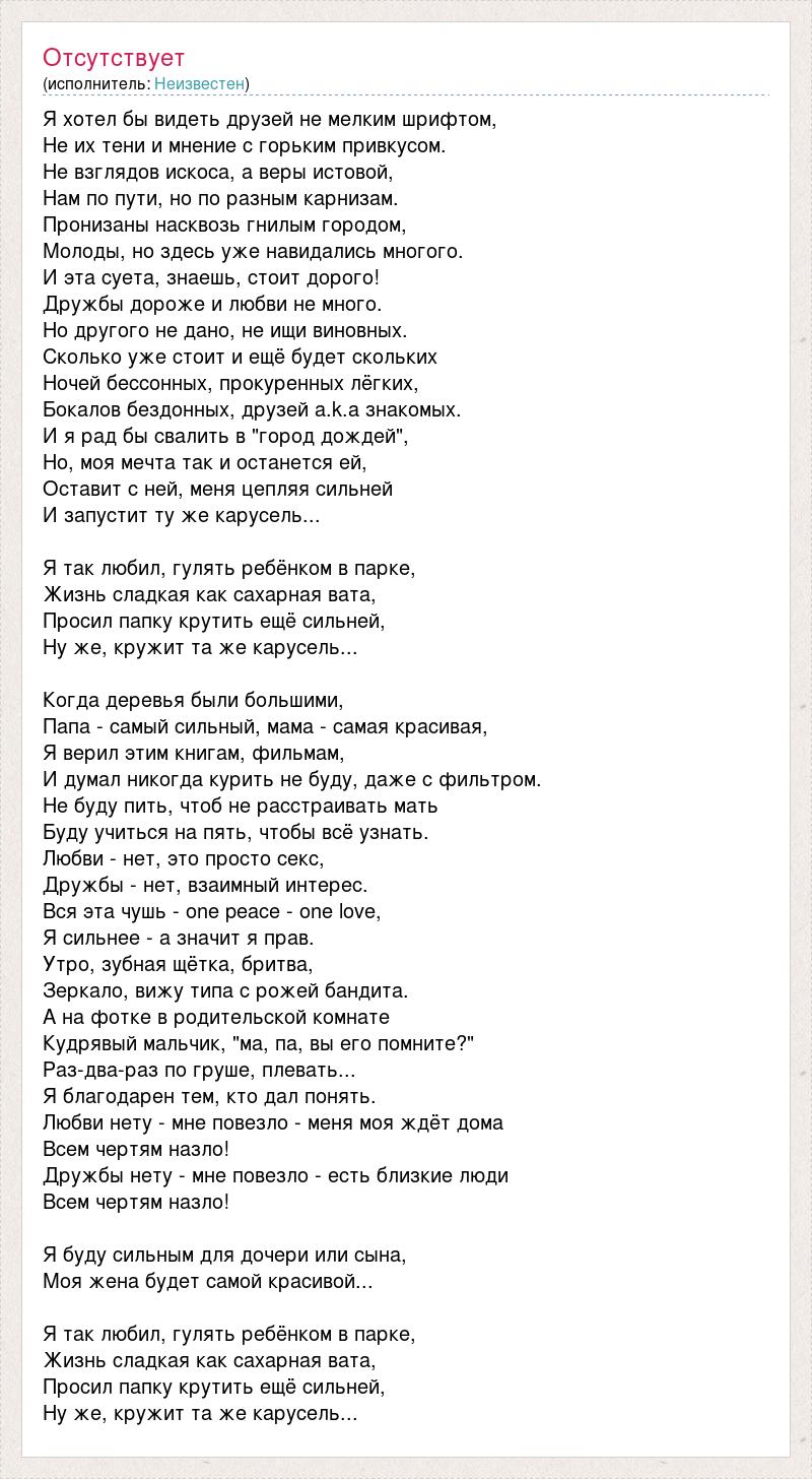 Я хотел бы видеть друзей не мелким шрифтом, Не их тени и мнение с горьким привкусом. Не взглядов искоса, а веры истовой, Нам по пути, но по разным карнизам. Пронизаны насквозь гнилым городом, Молоды, но здесь уже навидались многого. И эта суета, знаешь, стоит дорого! Дружбы дороже и любви не много. Но другого не дано, не ищи виновных. Сколько уже стоит и ещё будет скольких Ночей бессонных, прокуренных лёгких, Бокалов бездонных, друзей а.k.а знакомых. И я рад бы свалить в "город дождей", Но, моя мечта так и останется ей, Оставит с ней, меня цепляя сильней И запустит ту же карусель... Я так любил, гулять ребёнком в парке, Жизнь сладкая как сахарная вата, Просил папку крутить ещё сильней, Ну же, кружит та же карусель... Когда деревья были большими, Папа - самый сильный, мама - самая красивая, Я верил этим книгам, фильмам, И думал никогда курить не буду, даже с фильтром. Не буду пить, чтоб не расстраивать мать Буду учиться на пять, чтобы всё узнать. Любви - нет, это просто секс, Дружбы - нет, взаимный интерес. Вся эта чушь - one peace - one love, Я сильнее - а значит я прав. Утро, зубная щётка, бритва, Зеркало, вижу типа с рожей бандита. А на фотке в родительской комнате Кудрявый мальчик, "ма, па, вы его помните?" Раз-два-раз по груше, плевать... Я благодарен тем, кто дал понять. Любви нету - мне повезло - меня моя ждёт дома Всем чертям назло! Дружбы нету - мне повезло - есть близкие люди Всем чертям назло! Я буду сильным для дочери или сына, Моя жена будет самой красивой... Я так любил, гулять ребёнком в парке, Жизнь сладкая как сахарная вата, Просил папку крутить ещё сильней, Ну же, кружит та же карусель...