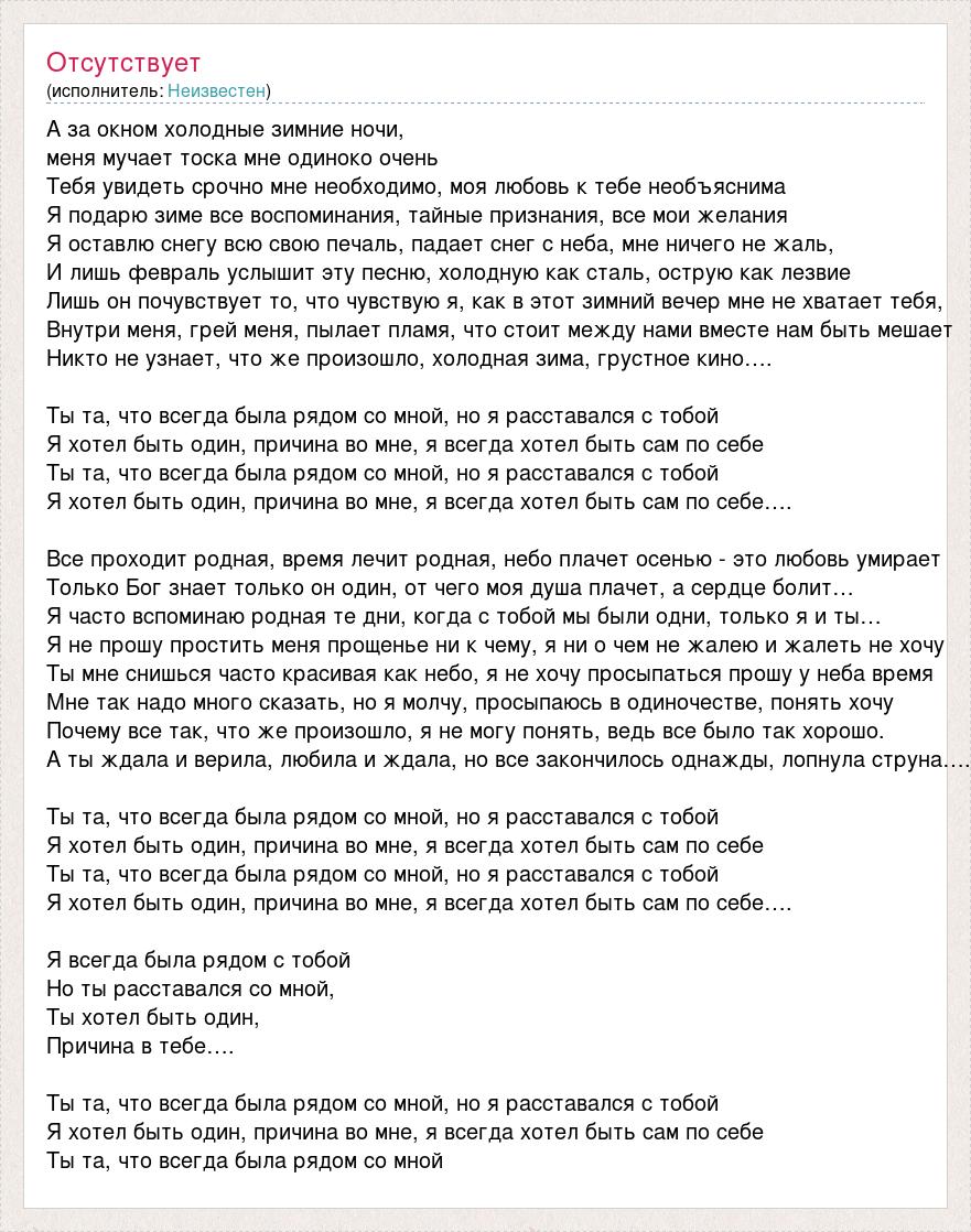 А за окном холодные зимние ночи, меня мучает тоска мне одиноко очень Тебя увидеть срочно мне необходимо, моя любовь к тебе необъяснима Я подарю зиме все воспоминания, тайные признания, все мои желания Я оставлю снегу всю свою печаль, падает снег с неба, мне ничего не жаль, И лишь февраль услышит эту песню, холодную как сталь, острую как лезвие Лишь он почувствует то, что чувствую я, как в этот зимний вечер мне не хватает тебя, Внутри меня, грей меня, пылает пламя, что стоит между нами вместе нам быть мешает Никто не узнает, что же произошло, холодная зима, грустное кино…. Ты та, что всегда была рядом со мной, но я расставался с тобой Я хотел быть один, причина во мне, я всегда хотел быть сам по себе Ты та, что всегда была рядом со мной, но я расставался с тобой Я хотел быть один, причина во мне, я всегда хотел быть сам по себе…. Все проходит родная, время лечит родная, небо плачет осенью - это любовь умирает Только Бог знает только он один, от чего моя душа плачет, а сердце болит… Я часто вспоминаю родная те дни, когда с тобой мы были одни, только я и ты… Я не прошу простить меня прощенье ни к чему, я ни о чем не жалею и жалеть не хочу Ты мне снишься часто красивая как небо, я не хочу просыпаться прошу у неба время Мне так надо много сказать, но я молчу, просыпаюсь в одиночестве, понять хочу Почему все так, что же произошло, я не могу понять, ведь все было так хорошо. А ты ждала и верила, любила и ждала, но все закончилось однажды, лопнула струна…. Ты та, что всегда была рядом со мной, но я расставался с тобой Я хотел быть один, причина во мне, я всегда хотел быть сам по себе Ты та, что всегда была рядом со мной, но я расставался с тобой Я хотел быть один, причина во мне, я всегда хотел быть сам по себе…. Я всегда была рядом с тобой Но ты расставался со мной, Ты хотел быть один, Причина в тебе…. Ты та, что всегда была рядом со мной, но я расставался с тобой Я хотел быть один, причина во мне, я всегда хотел быть сам по себе Ты та, что всегда была рядом со мной