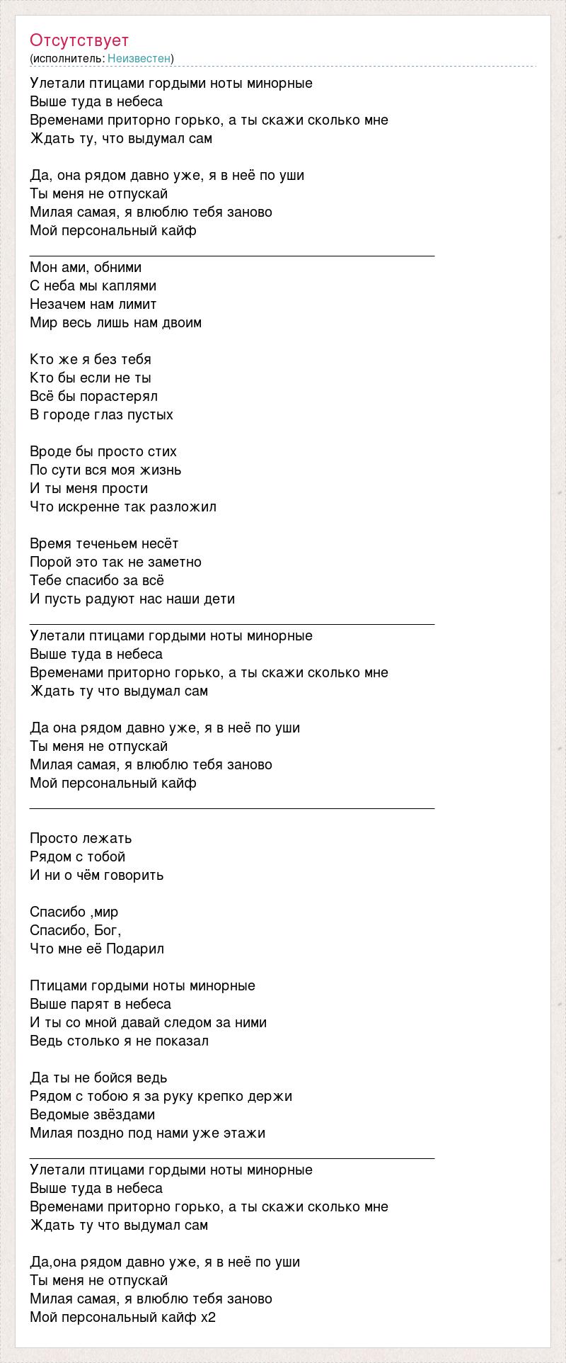 Улетали птицами гордыми ноты минорные Выше туда в небеса Временами приторно горько, а ты скажи сколько мне Ждать ту, что выдумал сам Да, она рядом давно уже, я в неё по уши Ты меня не отпускай Милая самая, я влюблю тебя заново Мой персональный кайф ____________________________________________________ Мон ами, обними С неба мы каплями Незачем нам лимит Мир весь лишь нам двоим Кто же я без тебя Кто бы если не ты Всё бы порастерял В городе глаз пустых Вроде бы просто стих По сути вся моя жизнь И ты меня прости Что искренне так разложил Время теченьем несёт Порой это так не заметно Тебе спасибо за всё И пусть радуют нас наши дети ____________________________________________________ Улетали птицами гордыми ноты минорные Выше туда в небеса Временами приторно горько, а ты скажи сколько мне Ждать ту что выдумал сам Да она рядом давно уже, я в неё по уши Ты меня не отпускай Милая самая, я влюблю тебя заново Мой персональный кайф ____________________________________________________ Просто лежать Рядом с тобой И ни о чём говорить Спасибо ,мир Спасибо, Бог, Что мне её Подарил Птицами гордыми ноты минорные Выше парят в небеса И ты со мной давай следом за ними Ведь столько я не показал Да ты не бойся ведь Рядом с тобою я за руку крепко держи Ведомые звёздами Милая поздно под нами уже этажи ____________________________________________________ Улетали птицами гордыми ноты минорные Выше туда в небеса Временами приторно горько, а ты скажи сколько мне Ждать ту что выдумал сам Да,она рядом давно уже, я в неё по уши Ты меня не отпускай Милая самая, я влюблю тебя заново Мой персональный кайф х2