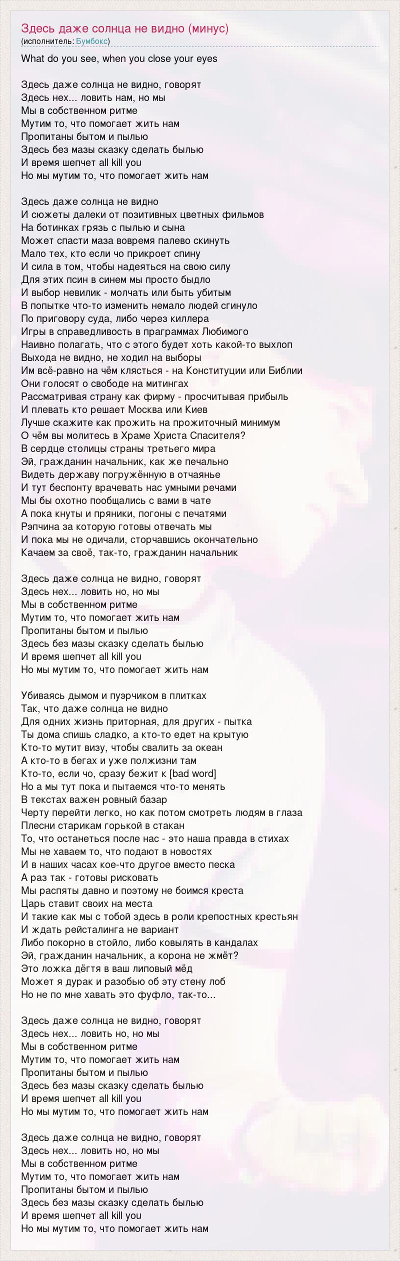 What do you see, when you close your eyes Здесь даже солнца не видно, говорят Здесь нех... ловить нам, но мы Мы в собственном ритме Мутим то, что помогает жить нам Пропитаны бытом и пылью Здесь без мазы сказку сделать былью И время шепчет аll kill you Но мы мутим то, что помогает жить нам Здесь даже солнца не видно И сюжеты далеки от позитивных цветных фильмов На ботинках грязь с пылью и сына Может спасти маза вовремя палево скинуть Мало тех, кто если чо прикроет спину И сила в том, чтобы надеяться на свою силу Для этих псин в синем мы просто быдло И выбор невилик - молчать или быть убитым В попытке что-то изменить немало людей сгинуло По приговору суда, либо через киллера Игры в справедливость в праграммах Любимого Наивно полагать, что с этого будет хоть какой-то выхлоп Выхода не видно, не ходил на выборы Им всё-равно на чём клясться - на Конституции или Библии Они голосят о свободе на митингах Рассматривая страну как фирму - просчитывая прибыль И плевать кто решает Москва или Киев Лучше скажите как прожить на прожиточный минимум О чём вы молитесь в Храме Христа Спасителя? В сердце столицы страны третьего мира Эй, гражданин начальник, как же печально Видеть державу погружённую в отчаянье И тут беспонту врачевать нас умными речами Мы бы охотно пообщались с вами в чате А пока кнуты и пряники, погоны с печатями Рэпчина за которую готовы отвечать мы И пока мы не одичали, сторчавшись окончательно Качаем за своё, так-то, гражданин начальник Здесь даже солнца не видно, говорят Здесь нех... ловить но, но мы Мы в собственном ритме Мутим то, что помогает жить нам Пропитаны бытом и пылью Здесь без мазы сказку сделать былью И время шепчет аll kill you Но мы мутим то, что помогает жить нам Убиваясь дымом и пуэрчиком в плитках Так, что даже солнца не видно Для одних жизнь приторная, для других - пытка Ты дома спишь сладко, а кто-то едет на крытую Кто-то мутит визу, чтобы свалить за океан А кто-то в бегах и уже полжизни там Кто-то, если чо, сразу бежит к [bad word] Но а мы тут пока и пытаемся что-то менять В текстах важен ровный базар Черту перейти легко, но как потом смотреть людям в глаза Плесни старикам горькой в стакан То, что останеться после нас - это наша правда в стихах Мы не хаваем то, что подают в новостях И в наших часах кое-что другое вместо песка А раз так - готовы рисковать Мы распяты давно и поэтому не боимся креста Царь ставит своих на места И такие как мы с тобой здесь в роли крепостных крестьян И ждать рейсталинга не вариант Либо покорно в стойло, либо ковылять в кандалах Эй, гражданин начальник, а корона не жмёт? Это ложка дёгтя в ваш липовый мёд Может я дурак и разобью об эту стену лоб Но не по мне хавать это фуфло, так-то... Здесь даже солнца не видно, говорят Здесь нех... ловить но, но мы Мы в собственном ритме Мутим то, что помогает жить нам Пропитаны бытом и пылью Здесь без мазы сказку сделать былью И время шепчет аll kill you Но мы мутим то, что помогает жить нам Здесь даже солнца не видно, говорят Здесь нех... ловить но, но мы Мы в собственном ритме Мутим то, что помогает жить нам Пропитаны бытом и пылью Здесь без мазы сказку сделать былью И время шепчет аll kill you Но мы мутим то, что помогает жить нам