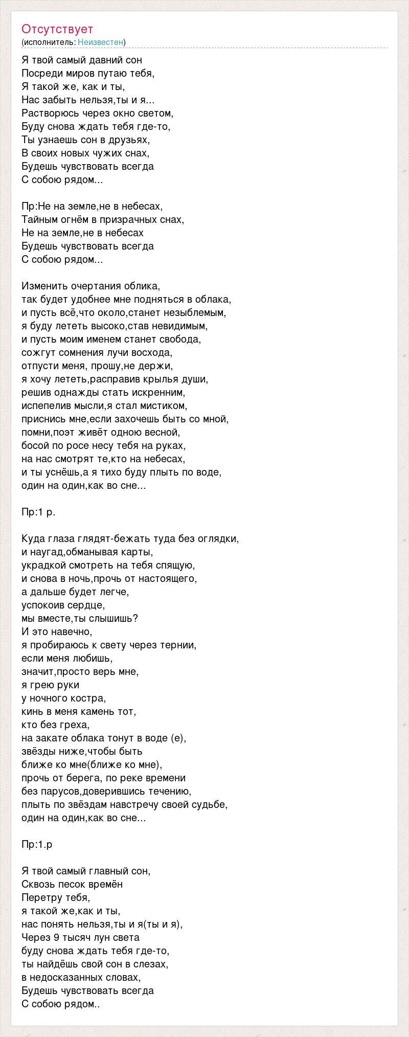Я твой самый давний сон Посреди миров путаю тебя, Я такой же, как и ты, Нас забыть нельзя,ты и я... Растворюсь через окно светом, Буду снова ждать тебя где-то, Ты узнаешь сон в друзьях, В своих новых чужих снах, Будешь чувствовать всегда С собою рядом... Пр:Не на земле,не в небесах, Тайным огнём в призрачных снах, Не на земле,не в небесах Будешь чувствовать всегда С собою рядом... Изменить очертания облика, так будет удобнее мне подняться в облака, и пусть всё,что около,станет незыблемым, я буду лететь высоко,став невидимым, и пусть моим именем станет свобода, сожгут сомнения лучи восхода, отпусти меня, прошу,не держи, я хочу лететь,расправив крылья души, решив однажды стать искренним, испепелив мысли,я стал мистиком, приснись мне,если захочешь быть со мной, помни,поэт живёт одною весной, босой по росе несу тебя на руках, на нас смотрят те,кто на небесах, и ты уснёшь,а я тихо буду плыть по воде, один на один,как во сне... Пр:1 р. Куда глаза глядят-бежать туда без оглядки, и наугад,обманывая карты, украдкой смотреть на тебя спящую, и снова в ночь,прочь от настоящего, а дальше будет легче, успокоив сердце, мы вместе,ты слышишь? И это навечно, я пробираюсь к свету через тернии, если меня любишь, значит,просто верь мне, я грею руки у ночного костра, кинь в меня камень тот, кто без греха, на закате облака тонут в воде (е), звёзды ниже,чтобы быть ближе ко мне(ближе ко мне), прочь от берега, по реке времени без парусов,доверившись течению, плыть по звёздам навстречу своей судьбе, один на один,как во сне... Пр:1.р Я твой самый главный сон, Сквозь песок времён Перетру тебя, я такой же,как и ты, нас понять нельзя,ты и я(ты и я), Через 9 тысяч лун света буду снова ждать тебя где-то, ты найдёшь свой сон в слезах, в недосказанных словах, Будешь чувствовать всегда С собою рядом..