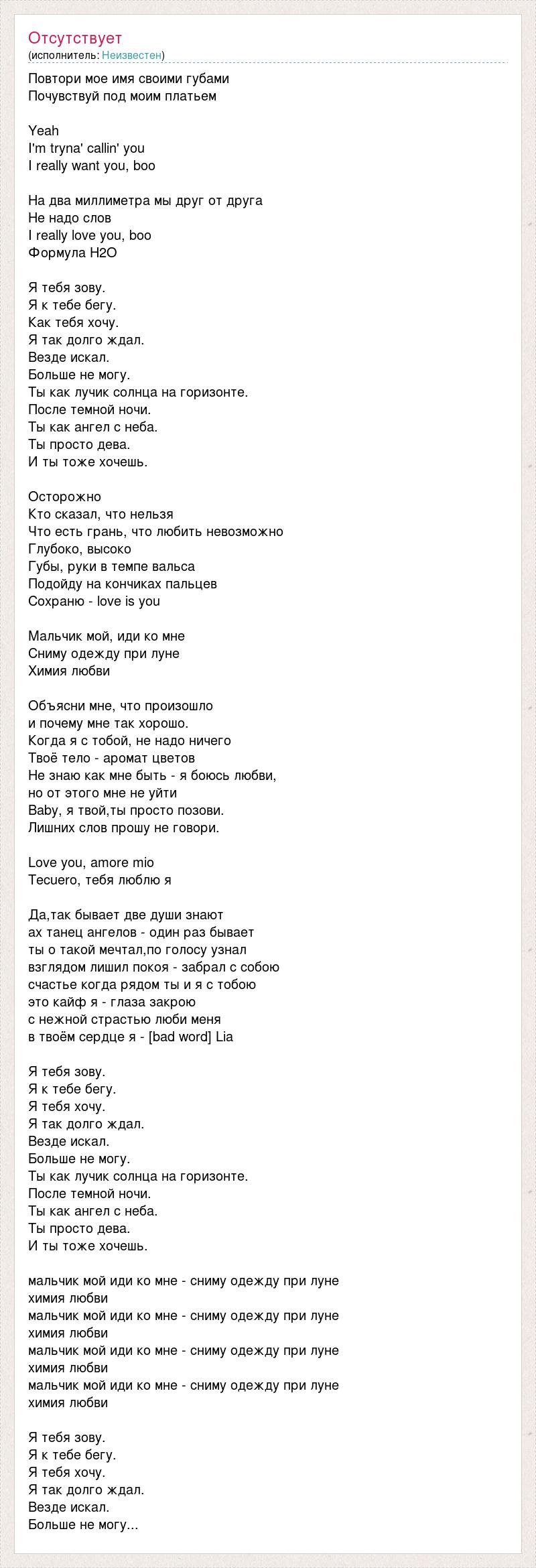 Повтори мое имя своими губами Почувствуй под моим платьем Yeah I'm tryna' callin' you I really want you, boo На два миллиметра мы друг от друга Не надо слов I really love you, boo Формула H2O Я тебя зову. Я к тебе бегу. Как тебя хочу. Я так долго ждал. Везде искал. Больше не могу. Ты как лучик солнца на горизонте. После темной ночи. Ты как ангел с неба. Ты просто дева. И ты тоже хочешь. Осторожно Кто сказал, что нельзя Что есть грань, что любить невозможно Глубоко, высоко Губы, руки в темпе вальса Подойду на кончиках пальцев Сохраню - love is you Мальчик мой, иди ко мне Сниму одежду при луне Химия любви Объясни мне, что произошло и почему мне так хорошо. Когда я с тобой, не надо ничего Твоё тело - аромат цветов Не знаю как мне быть - я боюсь любви, но от этого мне не уйти Baby, я твой,ты просто позови. Лишних слов прошу не говори. Love you, amore mio Tecuero, тебя люблю я Да,так бывает две души знают ах танец ангелов - один раз бывает ты о такой мечтал,по голосу узнал взглядом лишил покоя - забрал с собою счастье когда рядом ты и я с тобою это кайф я - глаза закрою с нежной страстью люби меня в твоём сердце я - [bad word] Lia Я тебя зову. Я к тебе бегу. Я тебя хочу. Я так долго ждал. Везде искал. Больше не могу. Ты как лучик солнца на горизонте. После темной ночи. Ты как ангел с неба. Ты просто дева. И ты тоже хочешь. мальчик мой иди ко мне - сниму одежду при луне химия любви мальчик мой иди ко мне - сниму одежду при луне химия любви мальчик мой иди ко мне - сниму одежду при луне химия любви мальчик мой иди ко мне - сниму одежду при луне химия любви Я тебя зову. Я к тебе бегу. Я тебя хочу. Я так долго ждал. Везде искал. Больше не могу...
