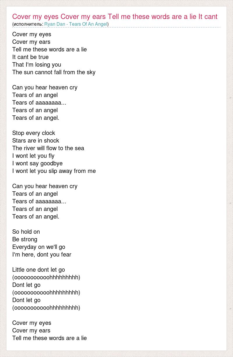 Cover my eyes Cover my ears Tell me these words are a lie It cant be true That I'm losing you The sun cannot fall from the sky Can you hear heaven cry Tears of an angel Tears of aaaaaaaa... Tears of an angel Tears of an angel. Stop every clock Stars are in shock The river will flow to the sea I wont let you fly I wont say goodbye I wont let you slip away from me Can you hear heaven cry Tears of an angel Tears of aaaaaaaa... Tears of an angel Tears of an angel. So hold on Be strong Everyday on we'll go I'm here, dont you fear Little one dont let go (ooooooooooohhhhhhhhh) Dont let go (ooooooooooohhhhhhhhh) Dont let go (ooooooooooohhhhhhhhh) Cover my eyes Cover my ears Tell me these words are a lie