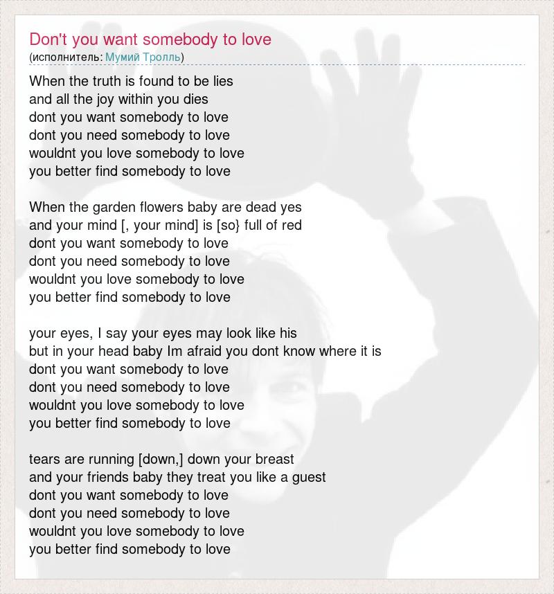 When the truth is found to be lies and all the joy within you dies dont you want somebody to love dont you need somebody to love wouldnt you love somebody to love you better find somebody to love When the garden flowers baby are dead yes and your mind [, your mind] is [so} full of red dont you want somebody to love dont you need somebody to love wouldnt you love somebody to love you better find somebody to love your eyes, I say your eyes may look like his but in your head baby Im afraid you dont know where it is dont you want somebody to love dont you need somebody to love wouldnt you love somebody to love you better find somebody to love tears are running [down,] down your breast and your friends baby they treat you like a guest dont you want somebody to love dont you need somebody to love wouldnt you love somebody to love you better find somebody to love