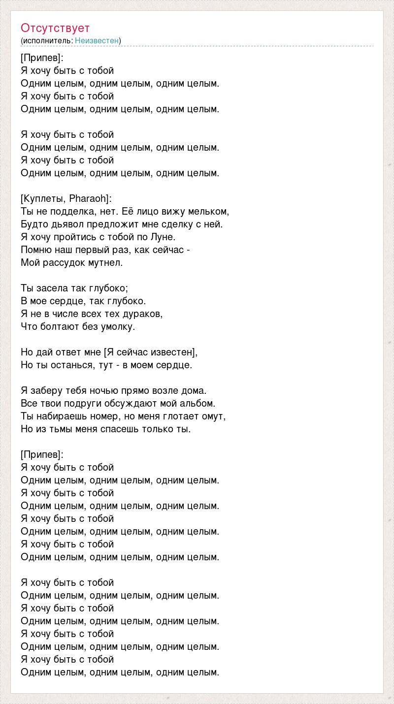 [Припев]: Я хочу быть с тобой Одним целым, одним целым, одним целым. Я хочу быть с тобой Одним целым, одним целым, одним целым. Я хочу быть с тобой Одним целым, одним целым, одним целым. Я хочу быть с тобой Одним целым, одним целым, одним целым. [Куплеты, Pharaoh]: Ты не подделка, нет. Её лицо вижу мельком, Будто дьявол предложит мне сделку с ней. Я хочу пройтись с тобой по Луне. Помню наш первый раз, как сейчас - Мой рассудок мутнел. Ты засела так глубоко; В мое сердце, так глубоко. Я не в числе всех тех дураков, Что болтают без умолку. Но дай ответ мне [Я сейчас известен], Но ты останься, тут - в моем сердце. Я заберу тебя ночью прямо возле дома. Все твои подруги обсуждают мой альбом. Ты набираешь номер, но меня глотает омут, Но из тьмы меня спасешь только ты. [Припев]: Я хочу быть с тобой Одним целым, одним целым, одним целым. Я хочу быть с тобой Одним целым, одним целым, одним целым. Я хочу быть с тобой Одним целым, одним целым, одним целым. Я хочу быть с тобой Одним целым, одним целым, одним целым. Я хочу быть с тобой Одним целым, одним целым, одним целым. Я хочу быть с тобой Одним целым, одним целым, одним целым. Я хочу быть с тобой Одним целым, одним целым, одним целым. Я хочу быть с тобой Одним целым, одним целым, одним целым.