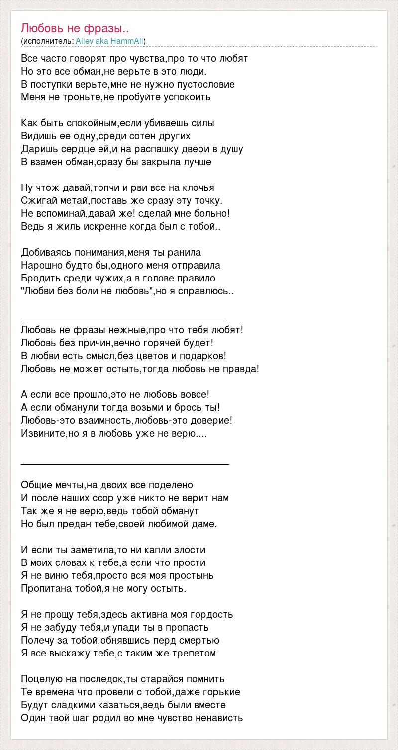 Все часто говорят про чувства,про то что любят Но это все обман,не верьте в это люди. В поступки верьте,мне не нужно пустословие Меня не троньте,не пробуйте успокоить Как быть спокойным,если убиваешь силы Видишь ее одну,среди сотен других Даришь сердце ей,и на распашку двери в душу В взамен обман,сразу бы закрыла лучше Ну чтож давай,топчи и рви все на клочья Сжигай метай,поставь же сразу эту точку. Не вспоминай,давай же! сделай мне больно! Ведь я жиль искренне когда был с тобой.. Добиваясь понимания,меня ты ранила Нарошно будто бы,одного меня отправила Бродить среди чужих,а в голове правило "Любви без боли не любовь",но я справлюсь.. _____________________________________ Любовь не фразы нежные,про что тебя любят! Любовь без причин,вечно горячей будет! В любви есть смысл,без цветов и подарков! Любовь не может остыть,тогда любовь не правда! А если все прошло,это не любовь вовсе! А если обманули тогда возьми и брось ты! Любовь-это взаимность,любовь-это доверие! Извините,но я в любовь уже не верю.... ______________________________________ Общие мечты,на двоих все поделено И после наших ссор уже никто не верит нам Так же я не верю,ведь тобой обманут Но был предан тебе,своей любимой даме. И если ты заметила,то ни капли злости В моих словах к тебе,а если что прости Я не виню тебя,просто вся моя простынь Пропитана тобой,я не могу остыть. Я не прощу тебя,здесь активна моя гордость Я не забуду тебя,и упади ты в пропасть Полечу за тобой,обнявшись перд смертью Я все выскажу тебе,с таким же трепетом Поцелую на последок,ты старайся помнить Те времена что провели с тобой,даже горькие Будут сладкими казаться,ведь были вместе Один твой шаг родил во мне чувство ненависть