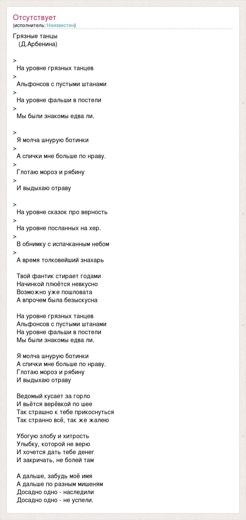 Грязные танцы (Д.Арбенина) > На уровне грязных танцев > Альфонсов с пустыми штанами > На уровне фальши в постели > Мы были знакомы едва ли. > Я молча шнурую ботинки > А спички мне больше по нраву. > Глотаю мороз и рябину > И выдыхаю отраву > На уровне сказок про верность > На уровне посланных на хер. > В обнимку с испачканным небом > А время толковейший знахарь Твой фантик стирает годами Начинкой плюётся невкусно Возможно уже пошловата А впрочем была безыскусна На уровне грязных танцев Альфонсов с пустыми штанами На уровне фальши в постели Мы были знакомы едва ли. Я молча шнурую ботинки А спички мне больше по нраву. Глотаю мороз и рябину И выдыхаю отраву Ведомый кусает за горло И вьётся верёвкой по шее Так страшно к тебе прикоснуться Так странно всё, так же жалею Убогую злобу и хитрость Улыбку, которой не верю И хочется дать тебе денег И закричать, не болей там А дальше, забудь моё имя А дальше по разным мишеням Досадно одно - наследили Досадно одно - не успели.