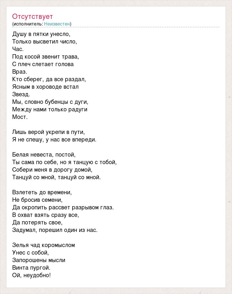 Душу в пятки унесло, Только высветил число, Час. Под косой звенит трава, С плеч слетает голова Враз. Кто сберег, да все раздал, Ясным в хороводе встал Звезд. Мы, словно бубенцы с дуги, Между нами только радуги Мост. Лишь верой укрепи в пути, Я не спешу, у нас все впереди. Белая невеста, постой, Ты сама по себе, но я танцую с тобой, Собери меня в дорогу домой, Танцуй со мной, танцуй со мной. Взлететь до времени, Не бросив семени, Да окропить рассвет разрывом глаз. В охват взять сразу все, Да потерять свое, Задумал, порешил один из нас. Зелья чад коромыслом Унес с собой, Запорошены мысли Винта пургой. Ой, неудобно!