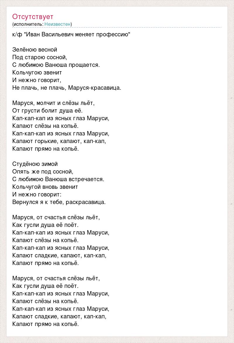 к/ф "Иван Васильевич меняет профессию" Зелёною весной Под старою сосной, С любимою Ванюша прощается. Кольчугою звенит И нежно говорит, Не плачь, не плачь, Маруся-красавица. Маруся, молчит и слёзы льёт, От грусти болит душа её. Кап-кап-кап из ясных глаз Маруси, Капают слёзы на копьё. Кап-кап-кап из ясных глаз Маруси, Капают горькие, капают, кап-кап, Капают прямо на копьё. Студёною зимой Опять же под сосной, С любимою Ванюша встречается. Кольчугой вновь звенит И нежно говорит: Вернулся я к тебе, раскрасавица. Маруся, от счастья слёзы льёт, Как гусли душа её поёт. Кап-кап-кап из ясных глаз Маруси, Капают слёзы на копьё. Кап-кап-кап из ясных глаз Маруси, Капают сладкие, капают, кап-кап, Капают прямо на копьё. Маруся, от счастья слёзы льёт, Как гусли душа её поёт. Кап-кап-кап из ясных глаз Маруси, Капают слёзы на копьё. Кап-кап-кап из ясных глаз Маруси, Капают сладкие, капают, кап-кап, Капают прямо на копьё.