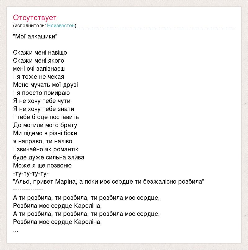 "Мої алкашики" Скажи мені навіщо Скажи мені якого мені очі запізнаєш І я тоже не чекая Мене мучать мої друзі І я просто помираю Я не хочу тебе чути Я не хочу тебе знати І тебе б оце поставить До могили мого брату Ми підемо в різні боки я направо, ти наліво І звичайно як романтік буде дуже сильна злива Може я ще позвоню -ту-ту-ту-ту- "Альо, привет Маріна, а поки моє сердце ти безжалісно розбила" -------------- А ти розбила, ти розбила, ти розбила моє сердце, Розбила моє сердце Кароліна, А ти розбила, ти розбила, ти розбила моє сердце, Розбила моє сердце Кароліна, ...