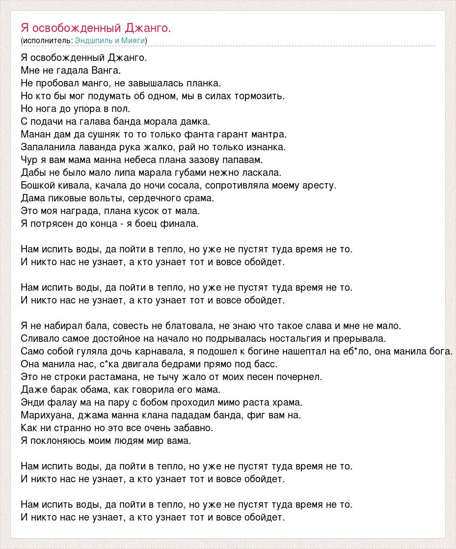 Я освобожденный Джанго. Мне не гадала Ванга. Не пробовал манго, не завышалась планка. Но кто бы мог подумать об одном, мы в силах тормозить. Но нога до упора в пол. С подачи на галава банда морала дамка. Манан дам да сушняк то то только фанта гарант мантра. Запаланила лаванда рука жалко, рай но только изнанка. Чур я вам мама манна небеса плана зазову папавам. Дабы не было мало липа марала губами нежно ласкала. Бошкой кивала, качала до ночи сосала, сопротивляла моему аресту. Дама пиковые вольты, сердечного срама. Это моя награда, плана кусок от мала. Я потрясен до конца - я боец финала. Нам испить воды, да пойти в тепло, но уже не пустят туда время не то. И никто нас не узнает, а кто узнает тот и вовсе обойдет. Нам испить воды, да пойти в тепло, но уже не пустят туда время не то. И никто нас не узнает, а кто узнает тот и вовсе обойдет. Я не набирал бала, совесть не блатовала, не знаю что такое слава и мне не мало. Сливало самое достойное на начало но подрывалась ностальгия и прерывала. Само собой гуляла дочь карнавала, я подошел к богине нашептал на еб*ло, она манила бога. Она манила нас, с*ка двигала бедрами прямо под басс. Это не строки растамана, не тычу жало от моих песен почернел. Даже барак обама, как говорила его мама. Энди фалау ма на пару с бобом проходил мимо раста храма. Марихуана, джама манна клана пададам банда, фиг вам на. Как ни странно но это все очень забавно. Я поклоняюсь моим людям мир вама. Нам испить воды, да пойти в тепло, но уже не пустят туда время не то. И никто нас не узнает, а кто узнает тот и вовсе обойдет. Нам испить воды, да пойти в тепло, но уже не пустят туда время не то. И никто нас не узнает, а кто узнает тот и вовсе обойдет.