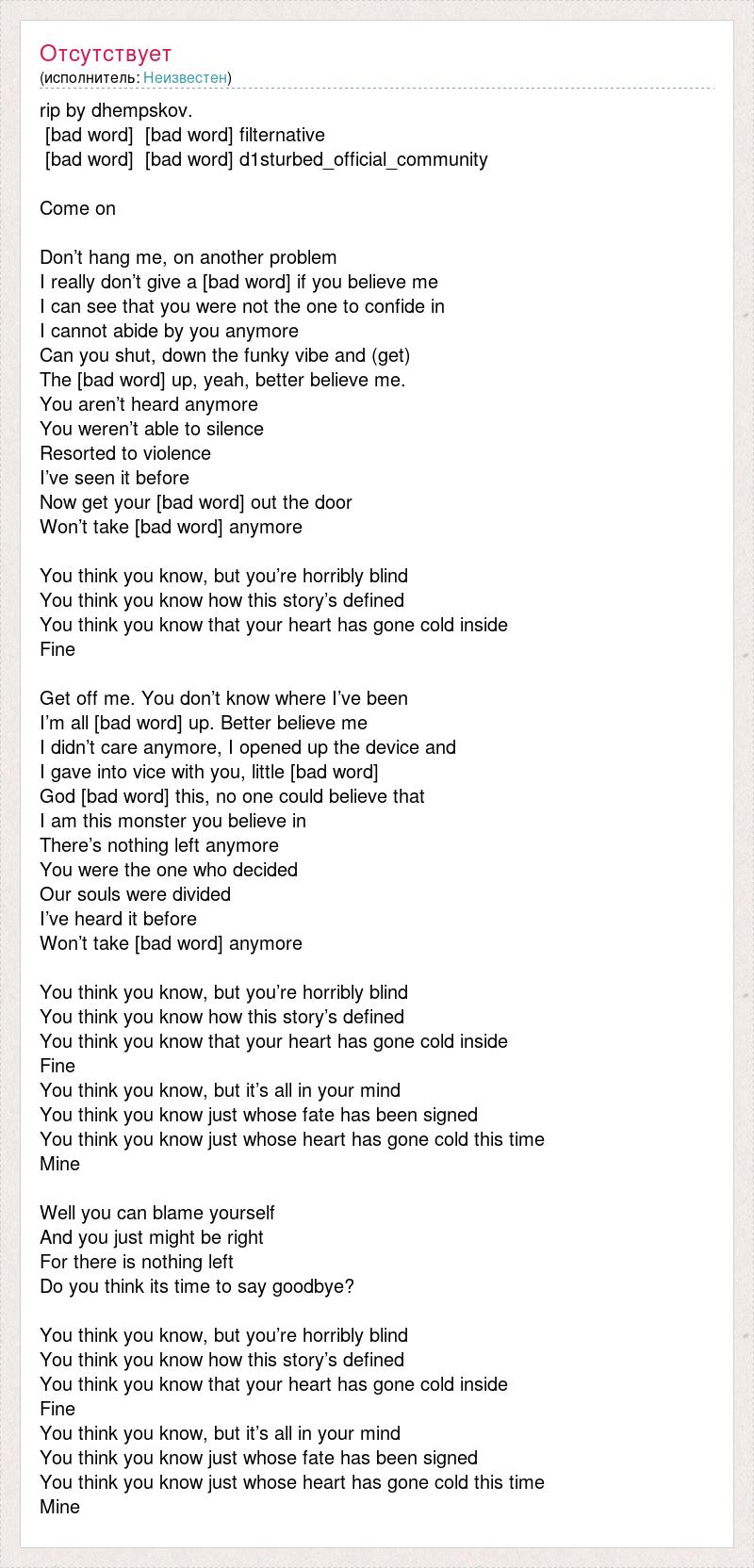 rip by dhempskov. [bad word] [bad word] filternative [bad word] [bad word] d1sturbed_official_community Come on Don’t hang me, on another problem I really don’t give a [bad word] if you believe me I can see that you were not the one to confide in I cannot abide by you anymore Can you shut, down the funky vibe and (get) The [bad word] up, yeah, better believe me. You aren’t heard anymore You weren’t able to silence Resorted to violence I’ve seen it before Now get your [bad word] out the door Won’t take [bad word] anymore You think you know, but you’re horribly blind You think you know how this story’s defined You think you know that your heart has gone cold inside Fine Get off me. You don’t know where I’ve been I’m all [bad word] up. Better believe me I didn’t care anymore, I opened up the device and I gave into vice with you, little [bad word] God [bad word] this, no one could believe that I am this monster you believe in There’s nothing left anymore You were the one who decided Our souls were divided I’ve heard it before Won’t take [bad word] anymore You think you know, but you’re horribly blind You think you know how this story’s defined You think you know that your heart has gone cold inside Fine You think you know, but it’s all in your mind You think you know just whose fate has been signed You think you know just whose heart has gone cold this time Mine Well you can blame yourself And you just might be right For there is nothing left Do you think its time to say goodbye? You think you know, but you’re horribly blind You think you know how this story’s defined You think you know that your heart has gone cold inside Fine You think you know, but it’s all in your mind You think you know just whose fate has been signed You think you know just whose heart has gone cold this time Mine