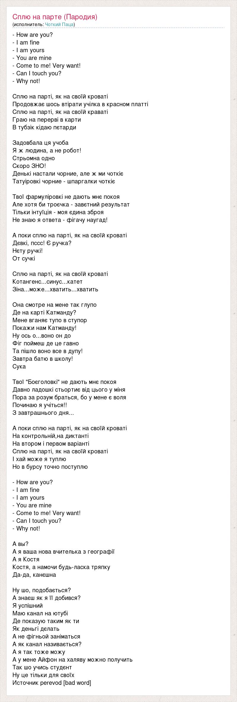 - How are you? - I am fine - I am yours - You are mine - Come to me! Very want! - Can I touch you? - Why not! Сплю на парті, як на своїй кроваті Продовжає шось втірати учілка в красном платті Сплю на парті, як на своїй краваті Граю на перерві в карти В тубзік кідаю пєтарди Задовбала ця учоба Я ж людина, а не робот! Стрьомна одно Скоро ЗНО! Денькі настали чорние, але ж ми чоткіє Татуіровкі чорние - шпаргалки чоткіє Твої фармуліровкі не дають мнє покоя Але хотя би троєчка - завєтний результат Тільки інтуїція - моя єдина зброя Не знаю я ответа - фігачу наугад! А поки сплю на парті, як на своїй кроваті Дєвкі, пссс! Є ручка? Нєту ручкі! От сучкі Сплю на парті, як на своїй кроваті Котангенс...синус...катет Зіна...може...хватить...хватить Она смотре на мене так глупо Де на карті Катманду? Мене вганяє тупо в ступор Покажи нам Катманду! Ну ось о...воно он до Фіг поймеш де це гавно Та пішло воно все в дупу! Завтра батю в школу! Сука Твої "Боєголовкі" не дають мнє покоя Давно ладошкі стьортиє від цього у міня Пора за розум браться, бо у мене є воля Починаю я учіться!! З завтрашнього дня... А поки сплю на парті, як на своїй кроваті На контрольній,на диктанті На втором і первом варіанті Сплю на парті, як на своїй кроваті І хай може я туплю Но в бурсу точно поступлю - How are you? - I am fine - I am yours - You are mine - Come to me! Very want! - Can I touch you? - Why not! А вы? А я ваша нова вчителька з географії А я Костя Костя, а намочи будь-ласка тряпку Да-да, канєшна Ну шо, подобається? А знаєш як я її добився? Я успішний Маю канал на ютубі Де показую таким як ти Як деньгі дєлать А не фігньой заніматься А як канал називається? А я так тоже можу А у мене Айфон на халяву можно получить Так шо учись студєнт Ну це тільки для своїх Источник perevod [bad word]