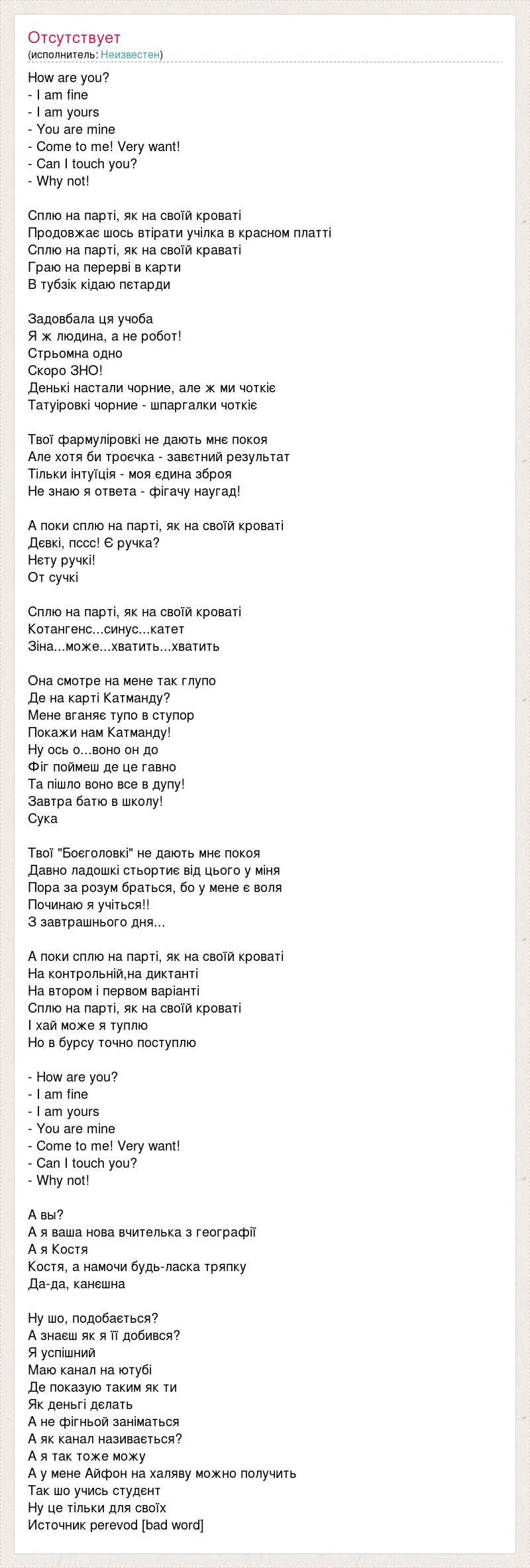 How are you? - I am fine - I am yours - You are mine - Come to me! Very want! - Can I touch you? - Why not! Сплю на парті, як на своїй кроваті Продовжає шось втірати учілка в красном платті Сплю на парті, як на своїй краваті Граю на перерві в карти В тубзік кідаю пєтарди Задовбала ця учоба Я ж людина, а не робот! Стрьомна одно Скоро ЗНО! Денькі настали чорние, але ж ми чоткіє Татуіровкі чорние - шпаргалки чоткіє Твої фармуліровкі не дають мнє покоя Але хотя би троєчка - завєтний результат Тільки інтуїція - моя єдина зброя Не знаю я ответа - фігачу наугад! А поки сплю на парті, як на своїй кроваті Дєвкі, пссс! Є ручка? Нєту ручкі! От сучкі Сплю на парті, як на своїй кроваті Котангенс...синус...катет Зіна...може...хватить...хватить Она смотре на мене так глупо Де на карті Катманду? Мене вганяє тупо в ступор Покажи нам Катманду! Ну ось о...воно он до Фіг поймеш де це гавно Та пішло воно все в дупу! Завтра батю в школу! Сука Твої "Боєголовкі" не дають мнє покоя Давно ладошкі стьортиє від цього у міня Пора за розум браться, бо у мене є воля Починаю я учіться!! З завтрашнього дня... А поки сплю на парті, як на своїй кроваті На контрольній,на диктанті На втором і первом варіанті Сплю на парті, як на своїй кроваті І хай може я туплю Но в бурсу точно поступлю - How are you? - I am fine - I am yours - You are mine - Come to me! Very want! - Can I touch you? - Why not! А вы? А я ваша нова вчителька з географії А я Костя Костя, а намочи будь-ласка тряпку Да-да, канєшна Ну шо, подобається? А знаєш як я її добився? Я успішний Маю канал на ютубі Де показую таким як ти Як деньгі дєлать А не фігньой заніматься А як канал називається? А я так тоже можу А у мене Айфон на халяву можно получить Так шо учись студєнт Ну це тільки для своїх Источник perevod [bad word]