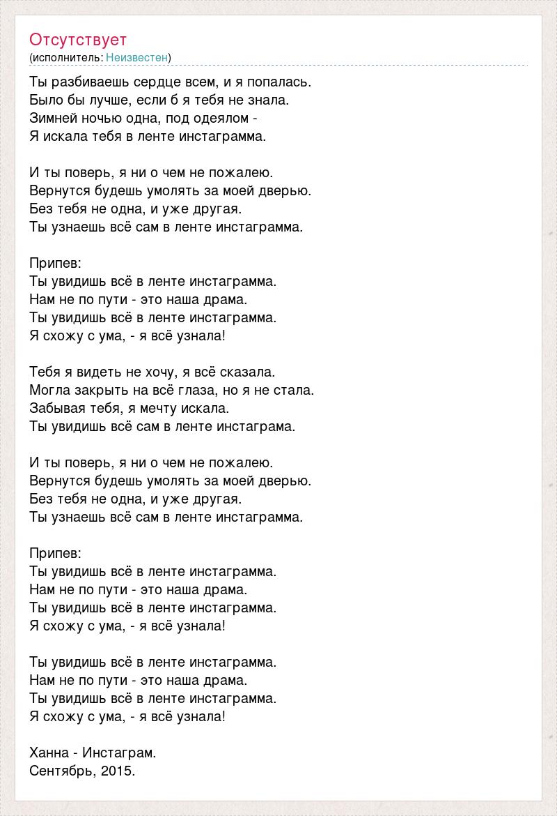 Ты разбиваешь сердце всем, и я попалась. Было бы лучше, если б я тебя не знала. Зимней ночью одна, под одеялом - Я искала тебя в ленте инстаграмма. И ты поверь, я ни о чем не пожалею. Вернутся будешь умолять за моей дверью. Без тебя не одна, и уже другая. Ты узнаешь всё сам в ленте инстаграмма. Припев: Ты увидишь всё в ленте инстаграмма. Нам не по пути - это наша драма. Ты увидишь всё в ленте инстаграмма. Я схожу с ума, - я всё узнала! Тебя я видеть не хочу, я всё сказала. Могла закрыть на всё глаза, но я не стала. Забывая тебя, я мечту искала. Ты увидишь всё сам в ленте инстаграма. И ты поверь, я ни о чем не пожалею. Вернутся будешь умолять за моей дверью. Без тебя не одна, и уже другая. Ты узнаешь всё сам в ленте инстаграмма. Припев: Ты увидишь всё в ленте инстаграмма. Нам не по пути - это наша драма. Ты увидишь всё в ленте инстаграмма. Я схожу с ума, - я всё узнала! Ты увидишь всё в ленте инстаграмма. Нам не по пути - это наша драма. Ты увидишь всё в ленте инстаграмма. Я схожу с ума, - я всё узнала! Ханна - Инстаграм. Сентябрь, 2015.