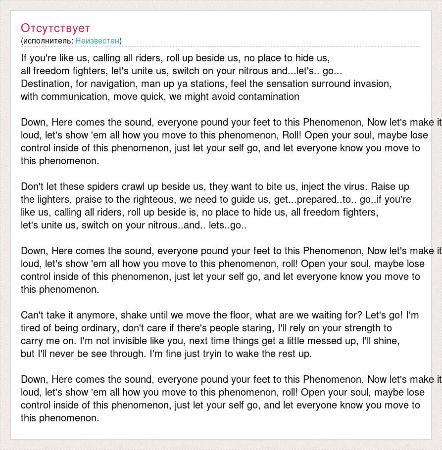 If you're like us, calling all riders, roll up beside us, no place to hide us, all freedom fighters, let's unite us, switch on your nitrous and...let's.. go... Destination, for navigation, man up ya stations, feel the sensation surround invasion, with communication, move quick, we might avoid contamination Down, Here comes the sound, everyone pound your feet to this Phenomenon, Now let's make it loud, let's show 'em all how you move to this phenomenon, Roll! Open your soul, maybe lose control inside of this phenomenon, just let your self go, and let everyone know you move to this phenomenon. Don't let these spiders crawl up beside us, they want to bite us, inject the virus. Raise up the lighters, praise to the righteous, we need to guide us, get...prepared..to.. go..if you're like us, calling all riders, roll up beside is, no place to hide us, all freedom fighters, let's unite us, switch on your nitrous..and.. lets..go.. Down, Here comes the sound, everyone pound your feet to this Phenomenon, Now let's make it loud, let's show 'em all how you move to this phenomenon, roll! Open your soul, maybe lose control inside of this phenomenon, just let your self go, and let everyone know you move to this phenomenon. Can't take it anymore, shake until we move the floor, what are we waiting for? Let's go! I'm tired of being ordinary, don't care if there's people staring, I'll rely on your strength to carry me on. I'm not invisible like you, next time things get a little messed up, I'll shine, but I'll never be see through. I'm fine just tryin to wake the rest up. Down, Here comes the sound, everyone pound your feet to this Phenomenon, Now let's make it loud, let's show 'em all how you move to this phenomenon, roll! Open your soul, maybe lose control inside of this phenomenon, just let your self go, and let everyone know you move to this phenomenon.