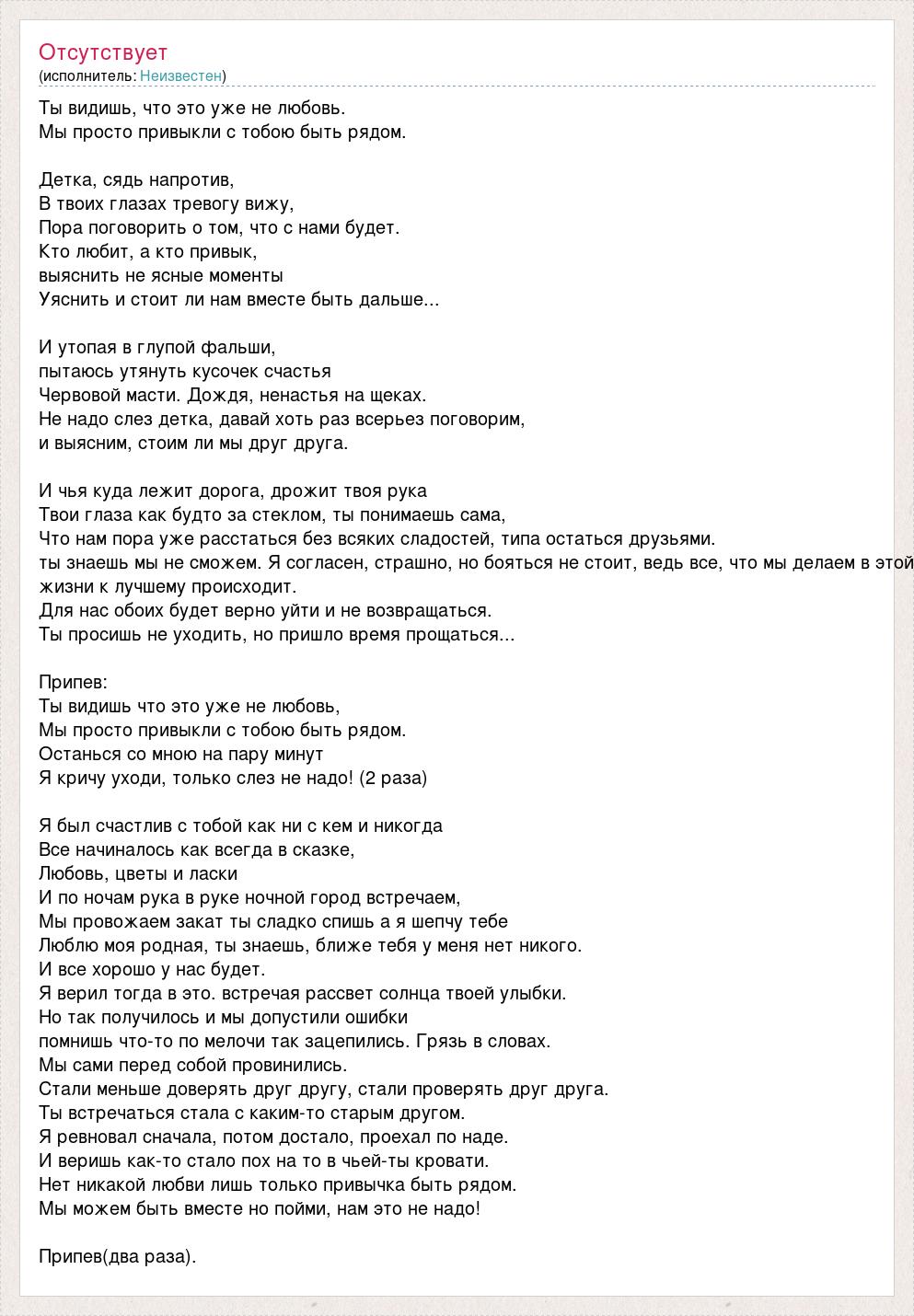 Ты видишь, что это уже не любовь. Мы просто привыкли с тобою быть рядом. Детка, сядь напротив, В твоих глазах тревогу вижу, Пора поговорить о том, что с нами будет. Кто любит, а кто привык, выяснить не ясные моменты Уяснить и стоит ли нам вместе быть дальше... И утопая в глупой фальши, пытаюсь утянуть кусочек счастья Червовой масти. Дождя, ненастья на щеках. Не надо слез детка, давай хоть раз всерьез поговорим, и выясним, стоим ли мы друг друга. И чья куда лежит дорога, дрожит твоя рука Твои глаза как будто за стеклом, ты понимаешь сама, Что нам пора уже расстаться без всяких сладостей, типа остаться друзьями. ты знаешь мы не сможем. Я согласен, страшно, но бояться не стоит, ведь все, что мы делаем в этой жизни к лучшему происходит. Для нас обоих будет верно уйти и не возвращаться. Ты просишь не уходить, но пришло время прощаться... Припев: Ты видишь что это уже не любовь, Мы просто привыкли с тобою быть рядом. Останься со мною на пару минут Я кричу уходи, только слез не надо! (2 раза) Я был счастлив с тобой как ни с кем и никогда Все начиналось как всегда в сказке, Любовь, цветы и ласки И по ночам рука в руке ночной город встречаем, Мы провожаем закат ты сладко спишь а я шепчу тебе Люблю моя родная, ты знаешь, ближе тебя у меня нет никого. И все хорошо у нас будет. Я верил тогда в это. встречая рассвет солнца твоей улыбки. Но так получилось и мы допустили ошибки помнишь что-то по мелочи так зацепились. Грязь в словах. Мы сами перед собой провинились. Стали меньше доверять друг другу, стали проверять друг друга. Ты встречаться стала с каким-то старым другом. Я ревновал сначала, потом достало, проехал по наде. И веришь как-то стало пох на то в чьей-ты кровати. Нет никакой любви лишь только привычка быть рядом. Мы можем быть вместе но пойми, нам это не надо! Припев(два раза).