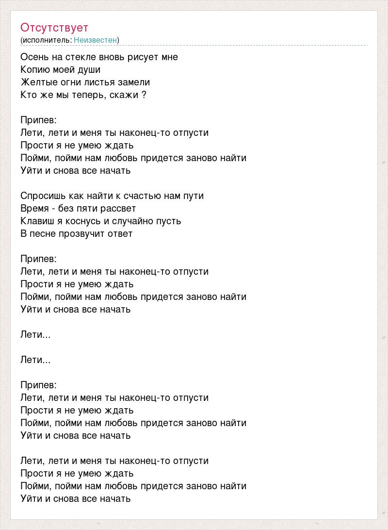 Осень на стекле вновь рисует мне Копию моей души Желтые огни листья замели Кто же мы теперь, скажи ? Припев: Лети, лети и меня ты наконец-то отпусти Прости я не умею ждать Пойми, пойми нам любовь придется заново найти Уйти и снова все начать Спросишь как найти к счастью нам пути Время - без пяти рассвет Клавиш я коснусь и случайно пусть В песне прозвучит ответ Припев: Лети, лети и меня ты наконец-то отпусти Прости я не умею ждать Пойми, пойми нам любовь придется заново найти Уйти и снова все начать Лети... Лети... Припев: Лети, лети и меня ты наконец-то отпусти Прости я не умею ждать Пойми, пойми нам любовь придется заново найти Уйти и снова все начать Лети, лети и меня ты наконец-то отпусти Прости я не умею ждать Пойми, пойми нам любовь придется заново найти Уйти и снова все начать
