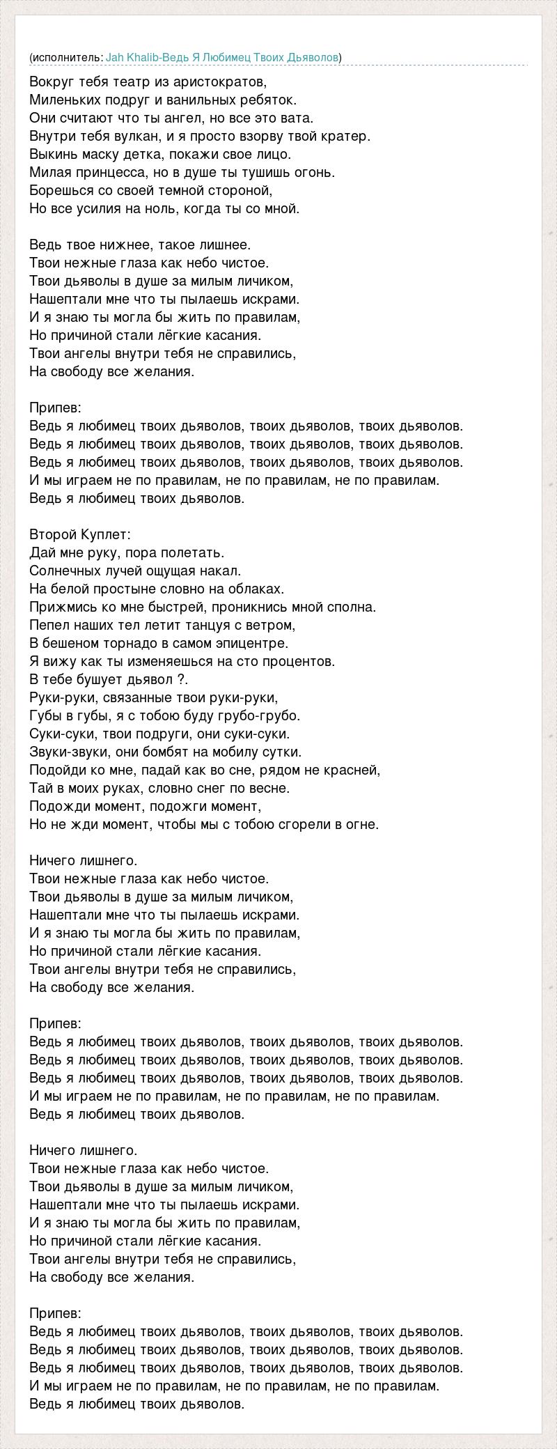 Вокруг тебя театр из аристократов, Миленьких подруг и ванильных ребяток. Они считают что ты ангел, но все это вата. Внутри тебя вулкан, и я просто взорву твой кратер. Выкинь маску детка, покажи свое лицо. Милая принцесса, но в душе ты тушишь огонь. Борешься со своей темной стороной, Но все усилия на ноль, когда ты со мной. Ведь твое нижнее, такое лишнее. Твои нежные глаза как небо чистое. Твои дьяволы в душе за милым личиком, Нашептали мне что ты пылаешь искрами. И я знаю ты могла бы жить по правилам, Но причиной стали лёгкие касания. Твои ангелы внутри тебя не справились, На свободу все желания. Припев: Ведь я любимец твоих дьяволов, твоих дьяволов, твоих дьяволов. Ведь я любимец твоих дьяволов, твоих дьяволов, твоих дьяволов. Ведь я любимец твоих дьяволов, твоих дьяволов, твоих дьяволов. И мы играем не по правилам, не по правилам, не по правилам. Ведь я любимец твоих дьяволов. Второй Куплет: Дай мне руку, пора полетать. Солнечных лучей ощущая накал. На белой простыне словно на облаках. Прижмись ко мне быстрей, проникнись мной сполна. Пепел наших тел летит танцуя с ветром, В бешеном торнадо в самом эпицентре. Я вижу как ты изменяешься на сто процентов. В тебе бушует дьявол ?. Руки-руки, связанные твои руки-руки, Губы в губы, я с тобою буду грубо-грубо. Суки-суки, твои подруги, они суки-суки. Звуки-звуки, они бомбят на мобилу сутки. Подойди ко мне, падай как во сне, рядом не красней, Тай в моих руках, словно снег по весне. Подожди момент, подожги момент, Но не жди момент, чтобы мы с тобою сгорели в огне. Ничего лишнего. Твои нежные глаза как небо чистое. Твои дьяволы в душе за милым личиком, Нашептали мне что ты пылаешь искрами. И я знаю ты могла бы жить по правилам, Но причиной стали лёгкие касания. Твои ангелы внутри тебя не справились, На свободу все желания. Припев: Ведь я любимец твоих дьяволов, твоих дьяволов, твоих дьяволов. Ведь я любимец твоих дьяволов, твоих дьяволов, твоих дьяволов. Ведь я любимец твоих дьяволов, твоих дьяволов, твоих дьяволов. И мы играем не по правилам, не по правилам, не по правилам. Ведь я любимец твоих дьяволов. Ничего лишнего. Твои нежные глаза как небо чистое. Твои дьяволы в душе за милым личиком, Нашептали мне что ты пылаешь искрами. И я знаю ты могла бы жить по правилам, Но причиной стали лёгкие касания. Твои ангелы внутри тебя не справились, На свободу все желания. Припев: Ведь я любимец твоих дьяволов, твоих дьяволов, твоих дьяволов. Ведь я любимец твоих дьяволов, твоих дьяволов, твоих дьяволов. Ведь я любимец твоих дьяволов, твоих дьяволов, твоих дьяволов. И мы играем не по правилам, не по правилам, не по правилам. Ведь я любимец твоих дьяволов.