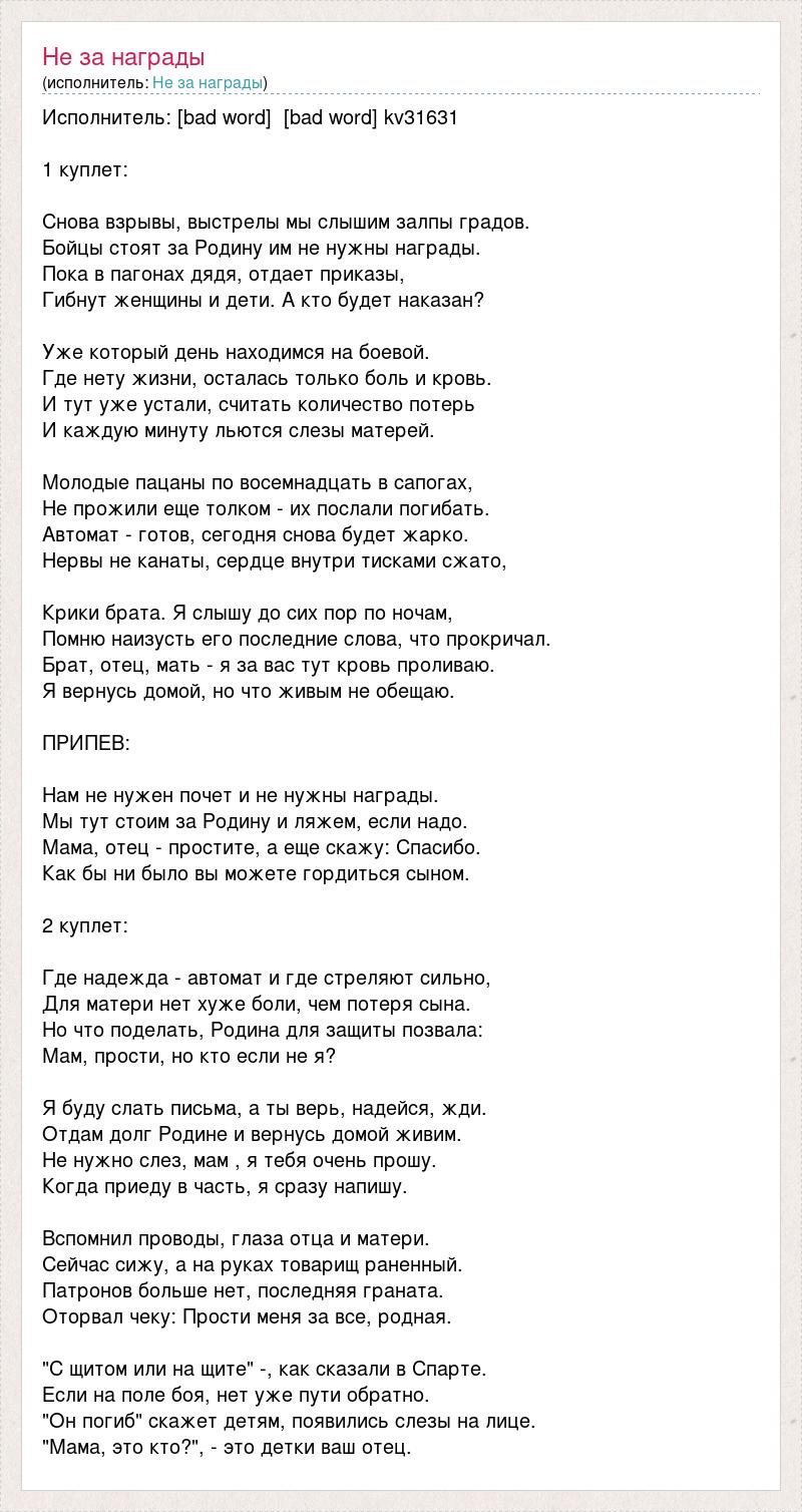 Исполнитель: [bad word] [bad word] kv31631 1 куплет: Снова взрывы, выстрелы мы слышим залпы градов. Бойцы стоят за Родину им не нужны награды. Пока в пагонах дядя, отдает приказы, Гибнут женщины и дети. А кто будет наказан? Уже который день находимся на боевой. Где нету жизни, осталась только боль и кровь. И тут уже устали, считать количество потерь И каждую минуту льются слезы матерей. Молодые пацаны по восемнадцать в сапогах, Не прожили еще толком - их послали погибать. Автомат - готов, сегодня снова будет жарко. Нервы не канаты, сердце внутри тисками сжато, Крики брата. Я слышу до сих пор по ночам, Помню наизусть его последние слова, что прокричал. Брат, отец, мать - я за вас тут кровь проливаю. Я вернусь домой, но что живым не обещаю. ПРИПЕВ: Нам не нужен почет и не нужны награды. Мы тут стоим за Родину и ляжем, если надо. Мама, отец - простите, а еще скажу: Спасибо. Как бы ни было вы можете гордиться сыном. 2 куплет: Где надежда - автомат и где стреляют сильно, Для матери нет хуже боли, чем потеря сына. Но что поделать, Родина для защиты позвала: Мам, прости, но кто если не я? Я буду слать письма, а ты верь, надейся, жди. Отдам долг Родине и вернусь домой живим. Не нужно слез, мам , я тебя очень прошу. Когда приеду в часть, я сразу напишу. Вспомнил проводы, глаза отца и матери. Сейчас сижу, а на руках товарищ раненный. Патронов больше нет, последняя граната. Оторвал чеку: Прости меня за все, родная. "С щитом или на щите" -, как сказали в Спарте. Если на поле боя, нет уже пути обратно. "Он погиб" скажет детям, появились слезы на лице. "Мама, это кто?", - это детки ваш отец.