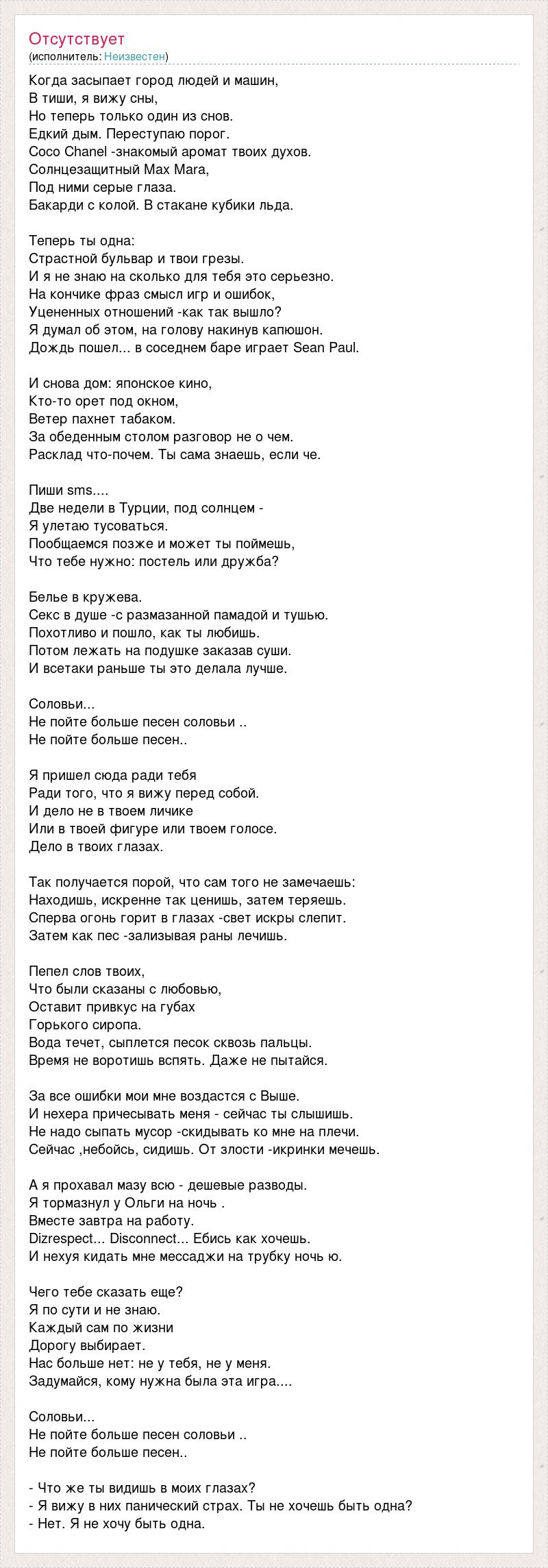 Когда засыпает город людей и машин, В тиши, я вижу сны, Но теперь только один из снов. Едкий дым. Переступаю порог. Coco Chanel -знакомый аромат твоих духов. Солнцезащитный Max Mara, Под ними серые глаза. Бакарди с колой. В стакане кубики льда. Теперь ты одна: Страстной бульвар и твои грезы. И я не знаю на сколько для тебя это серьезно. На кончике фраз смысл игр и ошибок, Уцененных отношений -как так вышло? Я думал об этом, на голову накинув капюшон. Дождь пошел... в соседнем баре играет Sean Paul. И снова дом: японское кино, Кто-то орет под окном, Ветер пахнет табаком. За обеденным столом разговор не о чем. Расклад что-почем. Ты сама знаешь, если че. Пиши sms.... Две недели в Турции, под солнцем - Я улетаю тусоваться. Пообщаемся позже и может ты поймешь, Что тебе нужно: постель или дружба? Белье в кружева. Секс в душе -с размазанной памадой и тушью. Похотливо и пошло, как ты любишь. Потом лежать на подушке заказав суши. И всетаки раньше ты это делала лучше. Соловьи... Не пойте больше песен соловьи .. Не пойте больше песен.. Я пришел сюда ради тебя Ради того, что я вижу перед собой. И дело не в твоем личике Или в твоей фигуре или твоем голосе. Дело в твоих глазах. Так получается порой, что сам того не замечаешь: Находишь, искренне так ценишь, затем теряешь. Сперва огонь горит в глазах -свет искры слепит. Затем как пес -зализывая раны лечишь. Пепел слов твоих, Что были сказаны с любовью, Оставит привкус на губах Горького сиропа. Вода течет, сыплется песок сквозь пальцы. Время не воротишь вспять. Даже не пытайся. За все ошибки мои мне воздастся с Выше. И нехера причесывать меня - сейчас ты слышишь. Не надо сыпать мусор -скидывать ко мне на плечи. Сейчас ,небойсь, сидишь. От злости -икринки мечешь. А я прохавал мазу всю - дешевые разводы. Я тормазнул у Ольги на ночь . Вместе завтра на работу. Dizrespect... Disconnect... Ебись как хочешь. И нехуя кидать мне мессаджи на трубку ночь ю. Чего тебе сказать еще? Я по сути и не знаю. Каждый сам по жизни Дорогу выбирает. Нас больше нет: не у тебя, не у меня. Задумайся, кому нужна была эта игра.... Соловьи... Не пойте больше песен соловьи .. Не пойте больше песен.. - Что же ты видишь в моих глазах? - Я вижу в них панический страх. Ты не хочешь быть одна? - Нет. Я не хочу быть одна.
