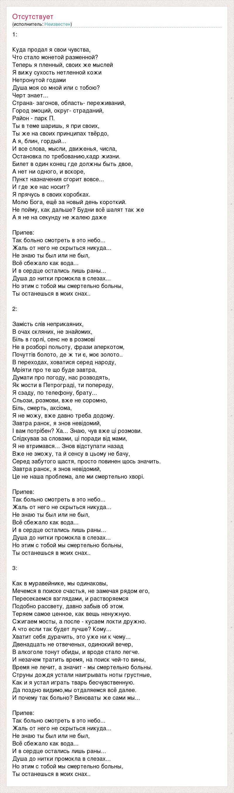 1: Куда продал я свои чувства, Что стало монетой разменной? Теперь я пленный, своих же мыслей Я вижу сухость нетленной кожи Нетронутой годами Душа моя со мной или с тобою? Черт знает... Страна- загонов, область- переживаний, Город эмоций, округ- страданий, Район - парк П. Ты в теме шаришь, я при своих, Ты же на своих принципах твёрдо, А я, блин, гордый... И все слова, мысли, движенья, числа, Остановка по требованию,кадр жизни. Билет в один конец где должны быть двое, А нет ни одного, и вскоре, Пункт назначения сгорит вовсе... И где же нас носит? Я прячусь в своих коробках. Молю Бога, ещё за новый день короткий. Не пойму, как дальше? Будни всё шалят так же А я не на секунду не жалею даже Припев: Так больно смотреть в это небо... Жаль от него не скрыться никуда... Не знаю ты был или не был, Всё сбежало как вода... И в сердце остались лишь раны... Душа до нитки промокла в слезах... Но этим с тобой мы смертельно больны, Ты останешься в моих снах.. 2: Замість слів неприкаяних, В очах скляних, не знайомих, Біль в горлі, сенс не в розмові Не в розборі польоту, фрази аперкотом, Почуттів болото, де ж ти є, моє золото.. В переходах, ховатися серед народу, Мріяти про те що буде завтра, Думати про погоду, нас розводять, Як мости в Петрограді, ти попереду, Я сзаду, по телефону, брату... Сльози, розмови, вже не соромно, Біль, смерть, аксіома, Я не можу, вже давно треба додому. Завтра ранок, я знов невідомий, І вам потрібен? Ха... Знаю, чув вже ці розмови. Слідкував за словами, ці поради від мами, Я не втримався... Знов відступати назад Вже не зможу, та й сенсу в цьому не бачу, Серед забутого щастя, просто повинен щось значить. Завтра ранок, я знов невідомий, Це не наша проблема, але ми смертельно хворі. Припев: Так больно смотреть в это небо... Жаль от него не скрыться никуда... Не знаю ты был или не был, Всё сбежало как вода... И в сердце остались лишь раны... Душа до нитки промокла в слезах... Но этим с тобой мы смертельно больны, Ты останешься в моих снах.. 3: Как в муравейнике, мы одинаковы, Мечемся в поиске счастья, не замечая рядом его, Пересекаемся взглядами, и растворяемся Подобно рассвету, давно забыв об этом. Теряем самое ценное, как вещь ненужную. Сжигаем мосты, а после - кусаем локти дружно. А что если так будет лучше? Кому... Хватит себя дурачить, это уже ни к чему... Двенадцать не отвеченых, одинокий вечер, В алкоголе тонут обиды, и вроде стало легче. И незачем тратить время, на поиск чей-то вины, Время не лечит, а значит - мы смертельно больны. Струны дождя устали наигрывать ноты грустные, Как и я устал играть тварь бесчувственную. Да поздно видимо,мы отдаляемся всё далее. И почему так больно? Виноваты же сами мы... Припев: Так больно смотреть в это небо... Жаль от него не скрыться никуда... Не знаю ты был или не был, Всё сбежало как вода... И в сердце остались лишь раны... Душа до нитки промокла в слезах... Но этим с тобой мы смертельно больны, Ты останешься в моих снах..