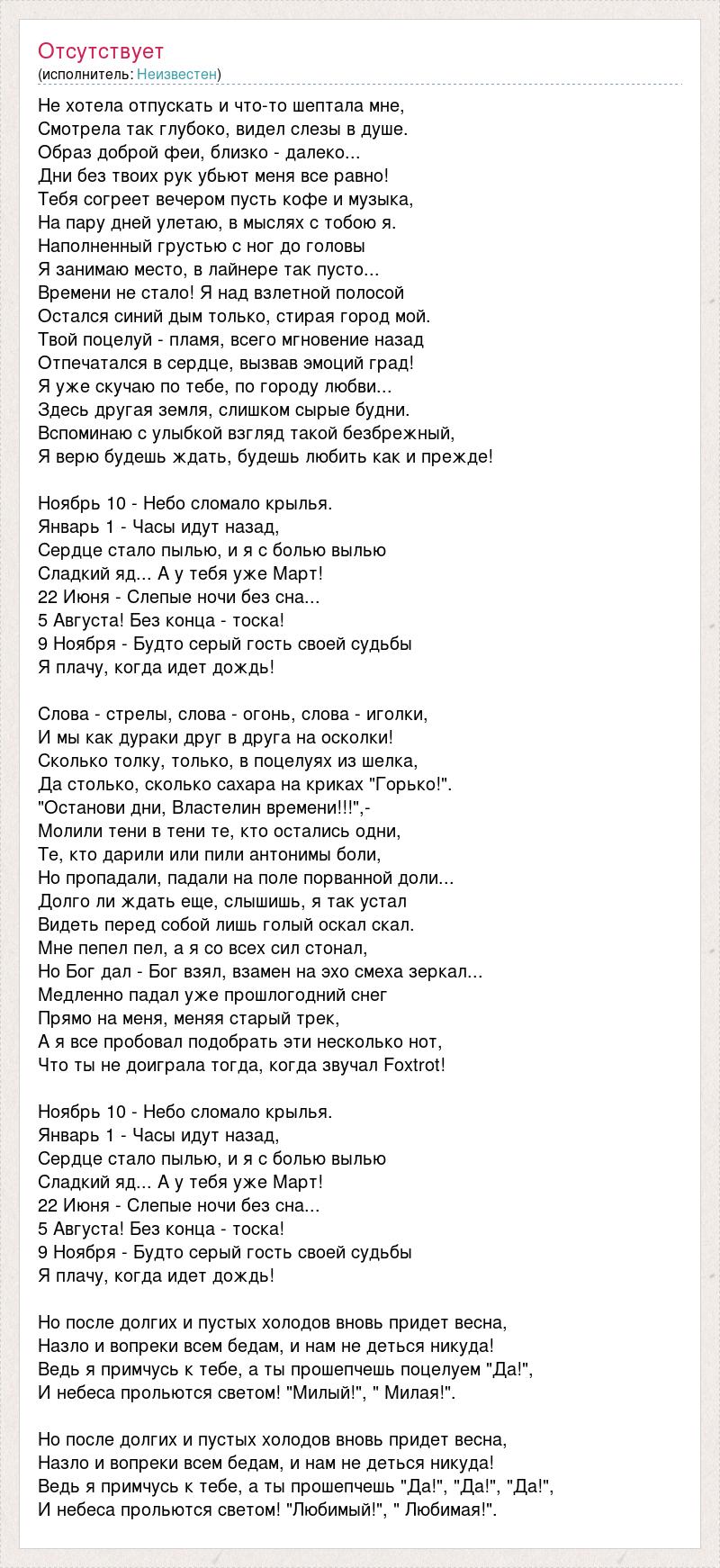 Не хотела отпускать и что-то шептала мне, Смотрела так глубоко, видел слезы в душе. Образ доброй феи, близко - далеко... Дни без твоих рук убьют меня все равно! Тебя согреет вечером пусть кофе и музыка, На пару дней улетаю, в мыслях с тобою я. Наполненный грустью с ног до головы Я занимаю место, в лайнере так пусто... Времени не стало! Я над взлетной полосой Остался синий дым только, стирая город мой. Твой поцелуй - пламя, всего мгновение назад Отпечатался в сердце, вызвав эмоций град! Я уже скучаю по тебе, по городу любви... Здесь другая земля, слишком сырые будни. Вспоминаю с улыбкой взгляд такой безбрежный, Я верю будешь ждать, будешь любить как и прежде! Ноябрь 10 - Небо сломало крылья. Январь 1 - Часы идут назад, Сердце стало пылью, и я с болью вылью Сладкий яд... А у тебя уже Март! 22 Июня - Слепые ночи без сна... 5 Августа! Без конца - тоска! 9 Ноября - Будто серый гость своей судьбы Я плачу, когда идет дождь! Слова - стрелы, слова - огонь, слова - иголки, И мы как дураки друг в друга на осколки! Сколько толку, только, в поцелуях из шелка, Да столько, сколько сахара на криках "Горько!". "Останови дни, Властелин времени!!!",- Молили тени в тени те, кто остались одни, Те, кто дарили или пили антонимы боли, Но пропадали, падали на поле порванной доли... Долго ли ждать еще, слышишь, я так устал Видеть перед собой лишь голый оскал скал. Мне пепел пел, а я со всех сил стонал, Но Бог дал - Бог взял, взамен на эхо смеха зеркал... Медленно падал уже прошлогодний снег Прямо на меня, меняя старый трек, А я все пробовал подобрать эти несколько нот, Что ты не доиграла тогда, когда звучал Foxtrot! Ноябрь 10 - Небо сломало крылья. Январь 1 - Часы идут назад, Сердце стало пылью, и я с болью вылью Сладкий яд... А у тебя уже Март! 22 Июня - Слепые ночи без сна... 5 Августа! Без конца - тоска! 9 Ноября - Будто серый гость своей судьбы Я плачу, когда идет дождь! Но после долгих и пустых холодов вновь придет весна, Назло и вопреки всем бедам, и нам не деться никуда! Ведь я примчусь к тебе, а ты прошепчешь поцелуем "Да!", И небеса прольются светом! "Милый!", " Милая!". Но после долгих и пустых холодов вновь придет весна, Назло и вопреки всем бедам, и нам не деться никуда! Ведь я примчусь к тебе, а ты прошепчешь "Да!", "Да!", "Да!", И небеса прольются светом! "Любимый!", " Любимая!".