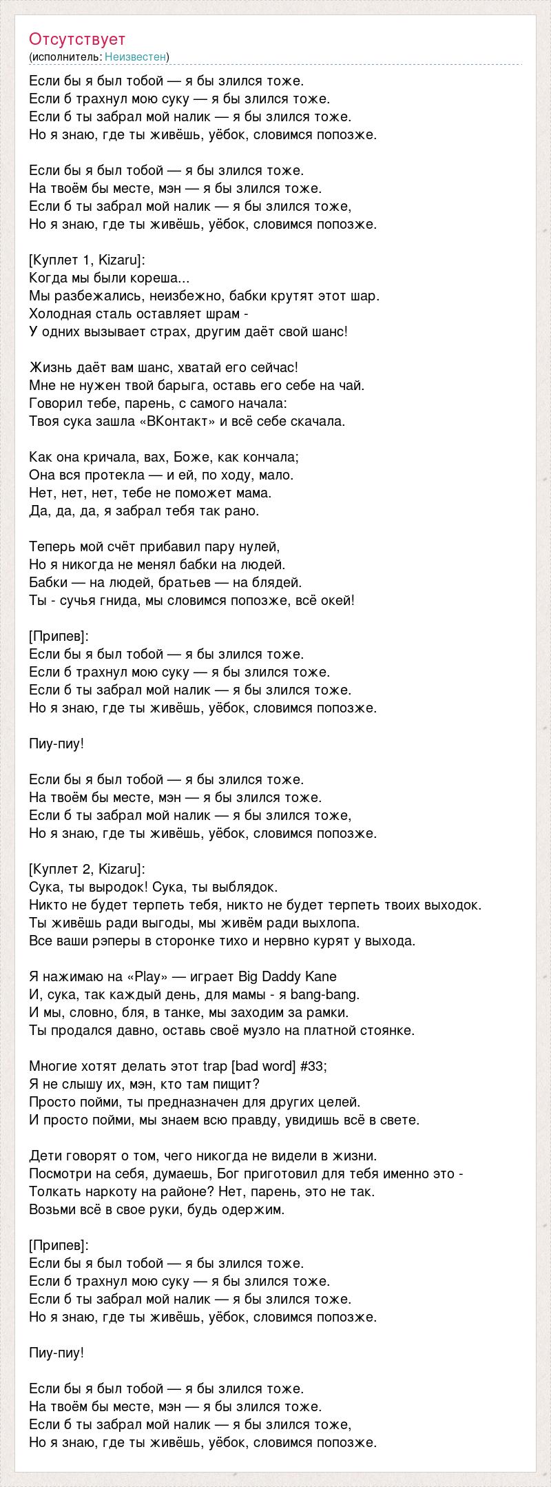 Если бы я был тобой — я бы злился тоже. Если б трахнул мою суку — я бы злился тоже. Если б ты забрал мой налик — я бы злился тоже. Но я знаю, где ты живёшь, уёбок, словимся попозже. Если бы я был тобой — я бы злился тоже. На твоём бы месте, мэн — я бы злился тоже. Если б ты забрал мой налик — я бы злился тоже, Но я знаю, где ты живёшь, уёбок, словимся попозже. [Куплет 1, Kizaru]: Когда мы были кореша... Мы разбежались, неизбежно, бабки крутят этот шар. Холодная сталь оставляет шрам - У одних вызывает страх, другим даёт свой шанс! Жизнь даёт вам шанс, хватай его сейчас! Мне не нужен твой барыга, оставь его себе на чай. Говорил тебе, парень, с самого начала: Твоя сука зашла «ВКонтакт» и всё себе скачала. Как она кричала, вах, Боже, как кончала; Она вся протекла — и ей, по ходу, мало. Нет, нет, нет, тебе не поможет мама. Да, да, да, я забрал тебя так рано. Теперь мой счёт прибавил пару нулей, Но я никогда не менял бабки на людей. Бабки — на людей, братьев — на блядей. Ты - сучья гнида, мы словимся попозже, всё окей! [Припев]: Если бы я был тобой — я бы злился тоже. Если б трахнул мою суку — я бы злился тоже. Если б ты забрал мой налик — я бы злился тоже. Но я знаю, где ты живёшь, уёбок, словимся попозже. Пиу-пиу! Если бы я был тобой — я бы злился тоже. На твоём бы месте, мэн — я бы злился тоже. Если б ты забрал мой налик — я бы злился тоже, Но я знаю, где ты живёшь, уёбок, словимся попозже. [Куплет 2, Kizaru]: Сука, ты выродок! Сука, ты выблядок. Никто не будет терпеть тебя, никто не будет терпеть твоих выходок. Ты живёшь ради выгоды, мы живём ради выхлопа. Все ваши рэперы в сторонке тихо и нервно курят у выхода. Я нажимаю на «Play» — играет Big Daddy Kane И, сука, так каждый день, для мамы - я bang-bang. И мы, словно, бля, в танке, мы заходим за рамки. Ты продался давно, оставь своё музло на платной стоянке. Многие хотят делать этот trap [bad word] #33; Я не слышу их, мэн, кто там пищит? Просто пойми, ты предназначен для других целей. И просто пойми, мы знаем всю правду, увидишь всё в свете. Дети говорят о том, чего никогда не видели в жизни. Посмотри на себя, думаешь, Бог приготовил для тебя именно это - Толкать наркоту на районе? Нет, парень, это не так. Возьми всё в свое руки, будь одержим. [Припев]: Если бы я был тобой — я бы злился тоже. Если б трахнул мою суку — я бы злился тоже. Если б ты забрал мой налик — я бы злился тоже. Но я знаю, где ты живёшь, уёбок, словимся попозже. Пиу-пиу! Если бы я был тобой — я бы злился тоже. На твоём бы месте, мэн — я бы злился тоже. Если б ты забрал мой налик — я бы злился тоже, Но я знаю, где ты живёшь, уёбок, словимся попозже.