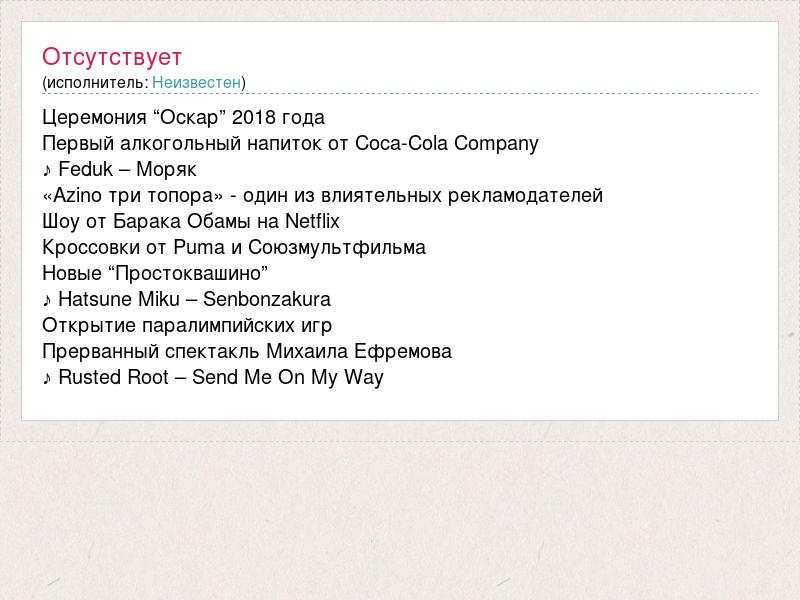 Церемония “Оскар” 2018 года Первый алкогольный напиток от Coca-Cola Company ♪ Feduk – Моряк «Azino три топора» - один из влиятельных рекламодателей Шоу от Барака Обамы на Netflix Кроссовки от Puma и Союзмультфильма Новые “Простоквашино” ♪ Hatsune Miku – Senbonzakura Открытие паралимпийских игр Прерванный спектакль Михаила Ефремова ♪ Rusted Root – Send Me On My Way