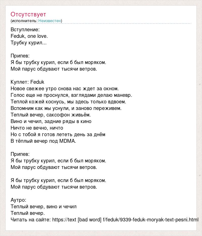 Вступление: Feduk, one love. Трубку курил... Припев: Я бы трубку курил, если б был моряком. Мой парус обдувают тысячи ветров. Куплет: Feduk Новое свежее утро снова нас ждет за окном. Голос еще не проснулся, взглядами делаю маневр. Теплой кожей коснусь, мы здесь только вдвоем. Вспомним как мы уснули, и заново переживем. Теплый вечер, саксофон живьём. Вино и чечил, задние ряды в кино Ничто не вечно, ничто Но с тобой я готов лететь день за днём В тёплый вечер под MDMA. Припев: Я бы трубку курил, если б был моряком. Мой парус обдувают тысячи ветров. Я бы трубку курил, если б был моряком. Мой парус обдувают тысячи ветров. Аутро: Теплый вечер, вино и чечил Теплый вечер. Читать на сайте: https://text [bad word] f/feduk/9339-feduk-moryak-text-pesni.html
