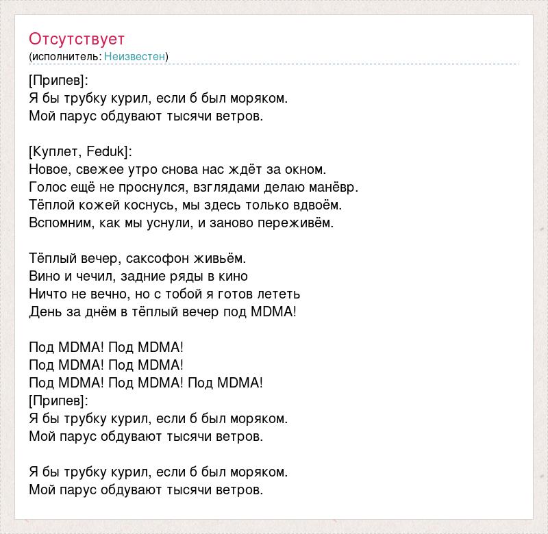 [Припев]: Я бы трубку курил, если б был моряком. Мой парус обдувают тысячи ветров. [Куплет, Feduk]: Новое, свежее утро снова нас ждёт за окном. Голос ещё не проснулся, взглядами делаю манёвр. Тёплой кожей коснусь, мы здесь только вдвоём. Вспомним, как мы уснули, и заново переживём. Тёплый вечер, саксофон живьём. Вино и чечил, задние ряды в кино Ничто не вечно, но с тобой я готов лететь День за днём в тёплый вечер под MDMA! Под MDMA! Под MDMA! Под MDMA! Под MDMA! Под MDMA! Под MDMA! Под MDMA! [Припев]: Я бы трубку курил, если б был моряком. Мой парус обдувают тысячи ветров. Я бы трубку курил, если б был моряком. Мой парус обдувают тысячи ветров.