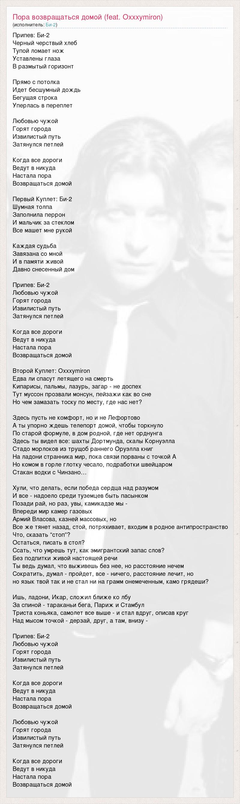 Припев: Би-2 Черный черствый хлеб Тупой ломает нож Уставлены глаза В размытый горизонт Прямо с потолка Идет бесшумный дождь Бегущая строка Уперлась в переплет Любовью чужой Горят города Извилистый путь Затянулся петлей Когда все дороги Ведут в никуда Настала пора Возвращаться домой Первый Куплет: Би-2 Шумная толпа Заполнила перрон И мальчик за стеклом Все машет мне рукой Каждая судьба Завязана со мной И в памяти живой Давно снесенный дом Припев: Би-2 Любовью чужой Горят города Извилистый путь Затянулся петлей Когда все дороги Ведут в никуда Настала пора Возвращаться домой Второй Куплет: Oxxxymiron Едва ли спасут летящего на смерть Кипарисы, пальмы, лазурь, загар - не доспех Тут муссон прозвали монсун, пейзажи как во сне Но чем замазать тоску по месту, где нас нет? Здесь пусть не комфорт, но и не Лефортово А ты упорно ждешь телепорт домой, чтобы торкнуло По старой формуле, в дом родной, где нет орднунга Здесь ты видел все: шахты Дортмунда, скалы Корнуэлла Стадо морлоков из трущоб раннего Оруэлла книг На ладони странника мир, пока связи порваны с точкой А Но комом в горле глотку чесало, подработки швейцаром Стакан водки с Чинзано… Хули, что делать, если победа сердца над разумом И все - надоело среди туземцев быть пасынком Позади рай, но раз, увы, камикадзе мы - Впереди мир камер газовых Армий Власова, казней массовых, но Все же тянет назад, стой, потряхивает, входим в родное антипространство Что, сказать “стоп”? Остаться, писать в стол? Ссать, что умрешь тут, как эмигрантский запас слов? Без подпитки живой настоящей речи Ты ведь думал, что выживешь без нее, но расстояние нечем Сократить, думал - пройдет, все - ничего, расстояние лечит, но но язык твой так и не стал ни на грамм онемеченным, камо грядеши? Ишь, ладони, Икар, сложил ближе ко лбу За спиной - тараканьи бега, Париж и Стамбул Триста коньяка, самолет все выше - и стал вдруг, описав круг Над мысом точкой - дерзай, друг, а там, внизу - Припев: Би-2 Любовью чужой Горят города Извилистый путь Затянулся петлей Когда все дороги Ведут в никуда Настала пора Возвращаться домой Любовью чужой Горят города Извилистый путь Затянулся петлей Когда все дороги Ведут в никуда Настала пора Возвращаться домой