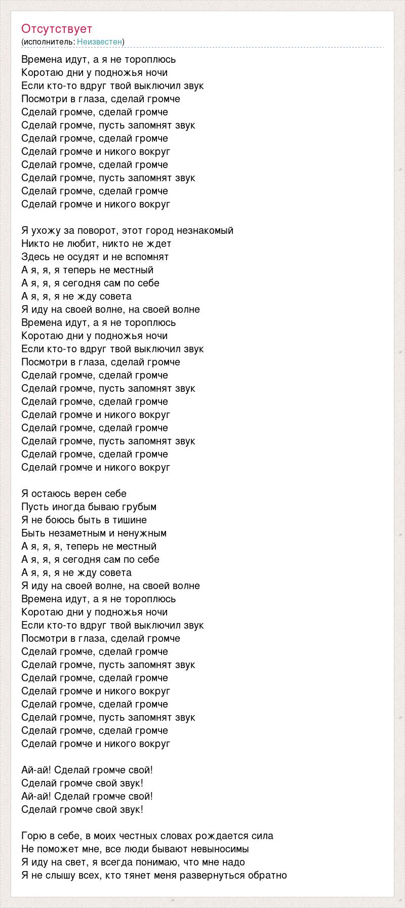 Времена идут, а я не тороплюсь Коротаю дни у подножья ночи Если кто-то вдруг твой выключил звук Посмотри в глаза, сделай громче Сделай громче, сделай громче Сделай громче, пусть запомнят звук Сделай громче, сделай громче Сделай громче и никого вокруг Сделай громче, сделай громче Сделай громче, пусть запомнят звук Сделай громче, сделай громче Сделай громче и никого вокруг Я ухожу за поворот, этот город незнакомый Никто не любит, никто не ждет Здесь не осудят и не вспомнят А я, я, я теперь не местный А я, я, я сегодня сам по себе А я, я, я не жду совета Я иду на своей волне, на своей волне Времена идут, а я не тороплюсь Коротаю дни у подножья ночи Если кто-то вдруг твой выключил звук Посмотри в глаза, сделай громче Сделай громче, сделай громче Сделай громче, пусть запомнят звук Сделай громче, сделай громче Сделай громче и никого вокруг Сделай громче, сделай громче Сделай громче, пусть запомнят звук Сделай громче, сделай громче Сделай громче и никого вокруг Я остаюсь верен себе Пусть иногда бываю грубым Я не боюсь быть в тишине Быть незаметным и ненужным А я, я, я, теперь не местный А я, я, я сегодня сам по себе А я, я, я не жду совета Я иду на своей волне, на своей волне Времена идут, а я не тороплюсь Коротаю дни у подножья ночи Если кто-то вдруг твой выключил звук Посмотри в глаза, сделай громче Сделай громче, сделай громче Сделай громче, пусть запомнят звук Сделай громче, сделай громче Сделай громче и никого вокруг Сделай громче, сделай громче Сделай громче, пусть запомнят звук Сделай громче, сделай громче Сделай громче и никого вокруг Ай-ай! Сделай громче свой! Сделай громче свой звук! Ай-ай! Сделай громче свой! Сделай громче свой звук! Горю в себе, в моих честных словах рождается сила Не поможет мне, все люди бывают невыносимы Я иду на свет, я всегда понимаю, что мне надо Я не слышу всех, кто тянет меня развернуться обратно