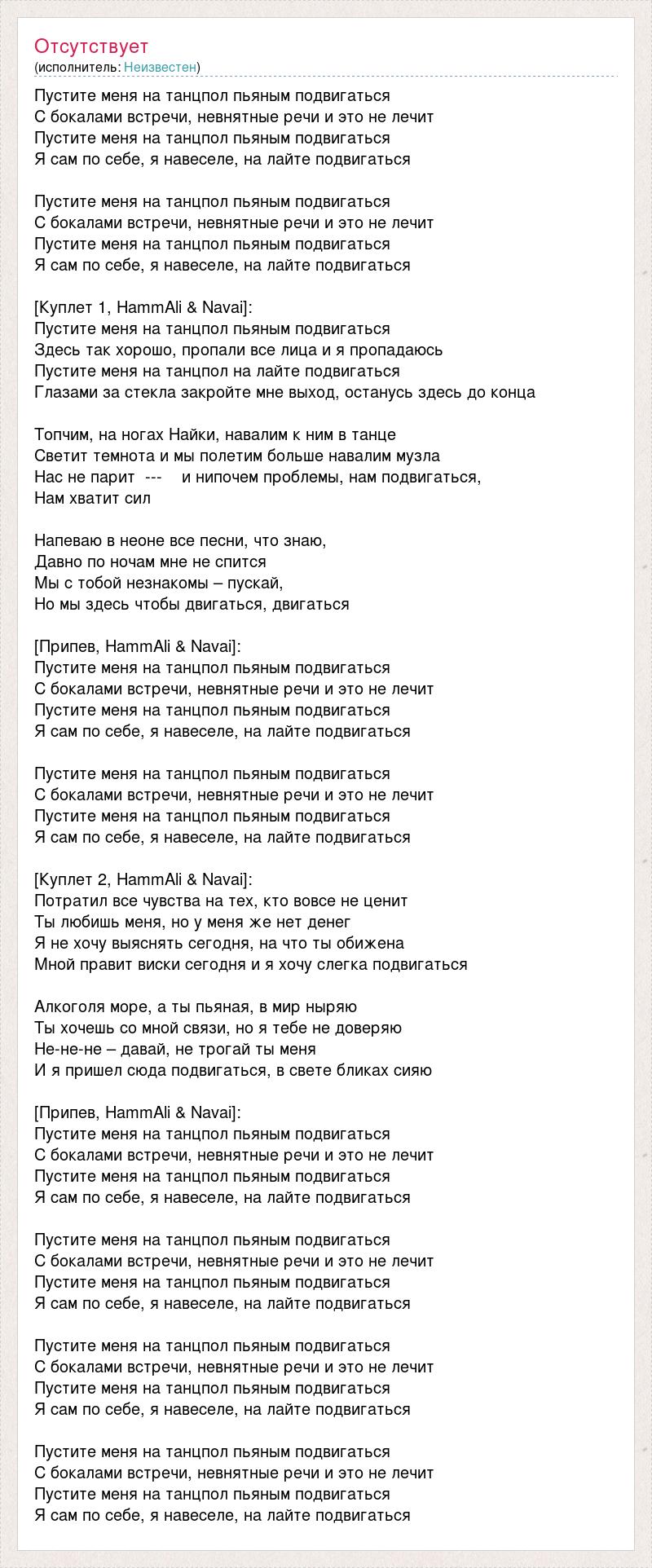 Пустите меня на танцпол пьяным подвигаться С бокалами встречи, невнятные речи и это не лечит Пустите меня на танцпол пьяным подвигаться Я сам по себе, я навеселе, на лайте подвигаться Пустите меня на танцпол пьяным подвигаться С бокалами встречи, невнятные речи и это не лечит Пустите меня на танцпол пьяным подвигаться Я сам по себе, я навеселе, на лайте подвигаться [Куплет 1, HammAli & Navai]: Пустите меня на танцпол пьяным подвигаться Здесь так хорошо, пропали все лица и я пропадаюсь Пустите меня на танцпол на лайте подвигаться Глазами за стекла закройте мне выход, останусь здесь до конца Топчим, на ногах Найки, навалим к ним в танце Светит темнота и мы полетим больше навалим музла Нас не парит --- и нипочем проблемы, нам подвигаться, Нам хватит сил Напеваю в неоне все песни, что знаю, Давно по ночам мне не спится Мы с тобой незнакомы – пускай, Но мы здесь чтобы двигаться, двигаться [Припев, HammAli & Navai]: Пустите меня на танцпол пьяным подвигаться С бокалами встречи, невнятные речи и это не лечит Пустите меня на танцпол пьяным подвигаться Я сам по себе, я навеселе, на лайте подвигаться Пустите меня на танцпол пьяным подвигаться С бокалами встречи, невнятные речи и это не лечит Пустите меня на танцпол пьяным подвигаться Я сам по себе, я навеселе, на лайте подвигаться [Куплет 2, HammAli & Navai]: Потратил все чувства на тех, кто вовсе не ценит Ты любишь меня, но у меня же нет денег Я не хочу выяснять сегодня, на что ты обижена Мной правит виски сегодня и я хочу слегка подвигаться Алкоголя море, а ты пьяная, в мир ныряю Ты хочешь со мной связи, но я тебе не доверяю Не-не-не – давай, не трогай ты меня И я пришел сюда подвигаться, в свете бликах сияю [Припев, HammAli & Navai]: Пустите меня на танцпол пьяным подвигаться С бокалами встречи, невнятные речи и это не лечит Пустите меня на танцпол пьяным подвигаться Я сам по себе, я навеселе, на лайте подвигаться Пустите меня на танцпол пьяным подвигаться С бокалами встречи, невнятные речи и это не лечит Пустите меня на танцпол пьяным подвигаться Я сам по себе, я навеселе, на лайте подвигаться Пустите меня на танцпол пьяным подвигаться С бокалами встречи, невнятные речи и это не лечит Пустите меня на танцпол пьяным подвигаться Я сам по себе, я навеселе, на лайте подвигаться Пустите меня на танцпол пьяным подвигаться С бокалами встречи, невнятные речи и это не лечит Пустите меня на танцпол пьяным подвигаться Я сам по себе, я навеселе, на лайте подвигаться